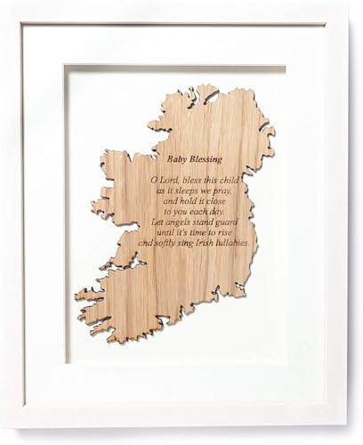 Esta bendición irlandesa para bebés dice «Oh Señor, bendice a este niño mientras duerme, rogamos, y mantenlo cerca de ti cada día. Que los ángeles estén de guardia hasta que sea hora de despertar y canten suavemente canciones de cuna irlandesas.» Esta bendición irlandesa traerá un poco de suerte irlandesa a los nuevos padres que podrían estar un poco tensos mientras su nuevo bebé duerme. Esta decoración de pared irlandesa es una hermosa adición a su guardería o un excelente regalo para aquellos que han sido bendecidos con un nuevo bebé. La bendición irlandesa para bebés viene en un marco enmarcado en blanco. Grabado en madera de restos de roble irlandés sostenible y transformado en una placa única que ha sido cortada en la forma de Irlanda. Esta bendición irlandesa para bebés ha sido meticulosamente elaborada por nuestro socio fabricante en Co Meath, Irlanda. Son una empresa familiar que ha estado innovando en el negocio de la carpintería de madera y creando hermosas piezas. Disfrutamos trabajar con ellos debido a su compromiso con el medio ambiente y su atención al detalle. En Biddy Murphy, estamos comprometidos a compartir la alegría de Irlanda a través de productos auténticamente irlandeses y regalos como esta bendición irlandesa para bebés.