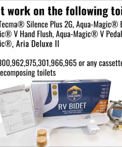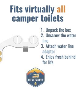Reversible Bidé para RV de Clean Camper. ¡Limpieza delantera y trasera al girar la perilla y nuestro bidé no solo se limpia a sí mismo, sino que también precarga el inodoro. No más estar de pie con el pie en la palanca de precarga para llenar el inodoro! Protege tu tanque de agua dulce de reflujo y asegúrate de que todos nuestros accesorios sean de metal, latón o acero inoxidable. ¡No plástico donde importa! ¡Ahorra dinero y árboles! Use un 80% menos de papel higiénico y mantén tu tanque negro líquido y sin obstrucciones. Nuestro kit viene con todo e se instala en minutos. Incluso incluye pernos de asiento de inodoro de acero inoxidable extra largos. ¡Controlas la cantidad de agua para cada lavado! Perfecto para acampar o cuando importa ahorrar niveles de tanque, ¡pero hace el trabajo más sucio! ¡No se necesitan tuberías o sistemas eléctricos especiales. Diseño reversible e instalación en los baños de RV más apretados y pequeños, ya que puedes elegir montar el bidé en el lado izquierdo o derecho del inodoro. Sin más obstrucciones: vertidos de tanque más rápidos y más limpios, nunca más lidiar con obstrucciones o la infame pirámide de caca de nuevo. Nuestro bidé reduce el uso de papel higiénico y la cantidad de papel higiénico en el tanque de retención en un 80% – ¡mantiene su tanque líquido! Simplemente proporcione la prueba de compra y si algo falla, reemplazaremos nuestro bidé para RV hasta por 24 meses. Sin preguntas. Propiedades y operado por estadounidenses. Respaldamos nuestros productos al 100%.