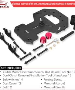 Este set de herramientas DPS6 clutch es compatible con modelos Ford Focus, C-MAX, Fiesta, Escape, Lincoln MKZ, S-MAX, Galaxy, Kuga, Ecosport, B-MAX, Toumeo Connect, Transit Connect y modelos Volvo como S60 II, S80 II, XC60, XC70 II, V60, V70 III. Incluye placa de desmontaje e instalación de transmisión dual clutch seca DPS6, herramienta de desbloqueo de unidad electromecánica de embrague, piernas de levantamiento, tornillos, tuerca, cubiertas de polvo, tornillo forzoso, mandril grande y pequeño.