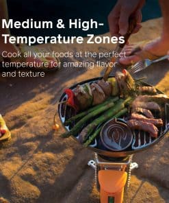 Transforma tu experiencia de acampada con esta parrilla portátil de mesa BioLite diseñada para funcionar con el CampStove 2. Convierte tu estufa de campamento en una superficie de cocción de leña real con este accesorio fácil de usar. La resistente parrilla de acero ofrece 55 sq. de espacio de cocción, lo que te permite cocinar deliciosas comidas al aire libre con el sabor distintivo de la madera real. Las patas plegables permiten un fácil transporte y guardado plano. La tapa de combustible incorporada facilita la recarga de leña sin tener que tocar la comida o desmontar la parrilla. Cocina tus alimentos a la perfección con las zonas de temperatura alta y media en la superficie de la parrilla. Disfruta de la versatilidad y el sabor único de cocinar con fuego de leña en todas tus expediciones al aire libre.