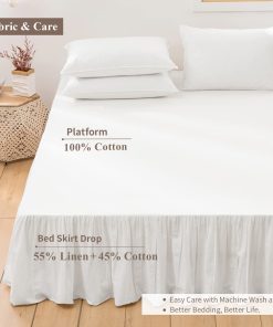 1. MATERIAL Falda de Cama: TELA DE ALGODÓN DE LINO MEZCLADO (55% Lino y 45% Algodón), Plataforma: 100% Algodón. Este producto ha sido certificado por OEKO-TEX STANDARD 100 para una producción de tela respetuosa con el medio ambiente, responsable y sostenible. 2. CARACTERÍSTICA La falda de cama viene con una plataforma que va entre el colchón y el somier para mantenerlo firme en su lugar, y al mismo tiempo puede evitar que el polvo debajo de la cama pase a través del espacio del tablero de la cama hasta el colchón. El dobladillo cuidadosamente ajustado puede ocultar los marcos de la cama y crear un generoso espacio de almacenamiento debajo de la cama, mientras le da a su cama un aspecto romántico de granja. 3. TAMAÑO El Tamaño Rey es de 78 x 80 pulgadas – La longitud de la caída es de 14 pulgadas. Solo contiene 1 Falda de Cama. 4. ELECCIÓN DE REGALO PERFECTA Regalo perfecto para aniversarios/ bodas/ fiestas de acción de gracias/ Navidad, festividades, cumpleaños, inauguración de la casa y más, también accesible y duradero para la posada, estancia en casa y hotel. 5. SERVICIO AL CLIENTE Ofrecemos servicio al cliente 24/7. Si hay algún problema con el producto, contáctenos, le ayudaremos a resolverlo en 24H.