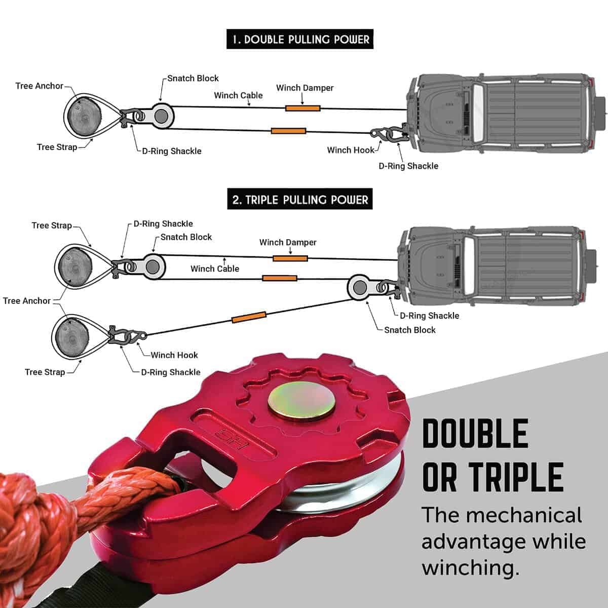 GearAmerica bloques de polea permiten trabajar de manera inteligente y fuerte! Clasificados en un sin precedentes 40,000 lbs de Resistencia Mínima de Rotura (20,000 lbs Límite de Carga de Trabajo) y aprovechando el poder de la física para cortar la carga en su winch o tirador de mano a la mitad (o 2/3 si se utilizan 2 bloques de winch), ¡haciendo que el proceso de recuperación sea mucho más fácil para usted y su equipo! ¿No puedes obtener un disparo en línea recta para sacar tu vehículo porque hay un árbol o una roca en tu camino? ¡No hay problema en absoluto! Simplemente instala tu bloque de polea a algo resistente con tus eslingas y correa de recuperación GearAmerica, y podrás sacar tu vehículo alrededor de cualquier obstáculo con facilidad. ¡Combina todo eso con la garantía de reemplazo sin problemas de por vida de GearAmerica, y tendrás una combinación ganadora! ¡Añade este bloque de polea a tu kit de recuperación hoy!