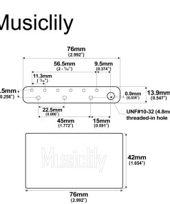 Musiclily Ultra 56.5mm String Spacing Brass 42mm Tremolo Block for USA/Mexico Fender Vintage Strat Style Classic Series Electric Guitar. Total string Spacing: 11.3×5 56.5mm (2-7/32 inch), mounting screw holes spacing: 45mm (1-49/64 inch), 42mm (1-21/32 inch) tall for 45mm thick body guitar. Quality full brass made, CNC precision engineered, adds more sustain and brings a more mellow accent to your guitar’s sound, good replacement or upgrading option for your guitar stocked zinc alloy tremolo block. 8mm (3/16 inch) UNF thread hole for inch size threaded-in style tremolo arm, easy to install and use. Package includes: 1 piece tremolo block and 3 pieces mounting screws.