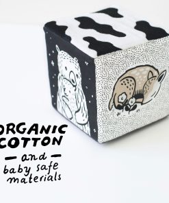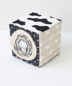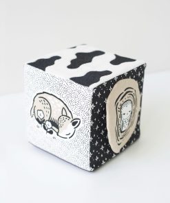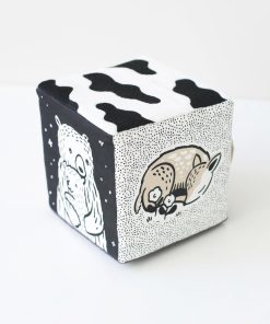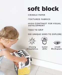¡Osos, corderos y un conejito tonto! ¡Tanto que hacer y ver en un gran bloque! Este bloque de tela suave está diseñado para deleitar los sentidos en desarrollo del bebé con gráficos de alto contraste, texturas, etiquetas y arrugas. ¡Presenta múltiples escenas y patrones del mundo de los animales bebés!