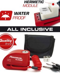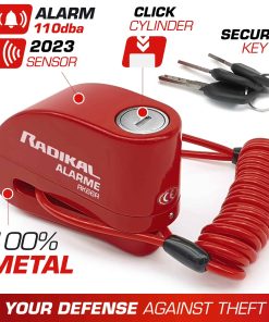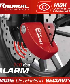 El bloqueo de disco de alarma para motocicleta RADIKAL RK66R está diseñado para ser práctico y fácil de usar. El bloqueo de disco de seguridad para motocicletas está hecho completamente de aleación de zamak, más resistente que el aluminio. Con 3 llaves de seguridad y alarma de 110 dB con nuevo sensor electrónico más funcional para protegerte mejor de los ladrones. Universal, se adapta a la mayoría de motocicletas, scooters, bicicletas y escúteres gracias a su eje de bloqueo de acero de 6 mm. Bloqueo de disco con alarma de la marca RADIKAL, la marca premium de seguridad para productos de motocicletas.