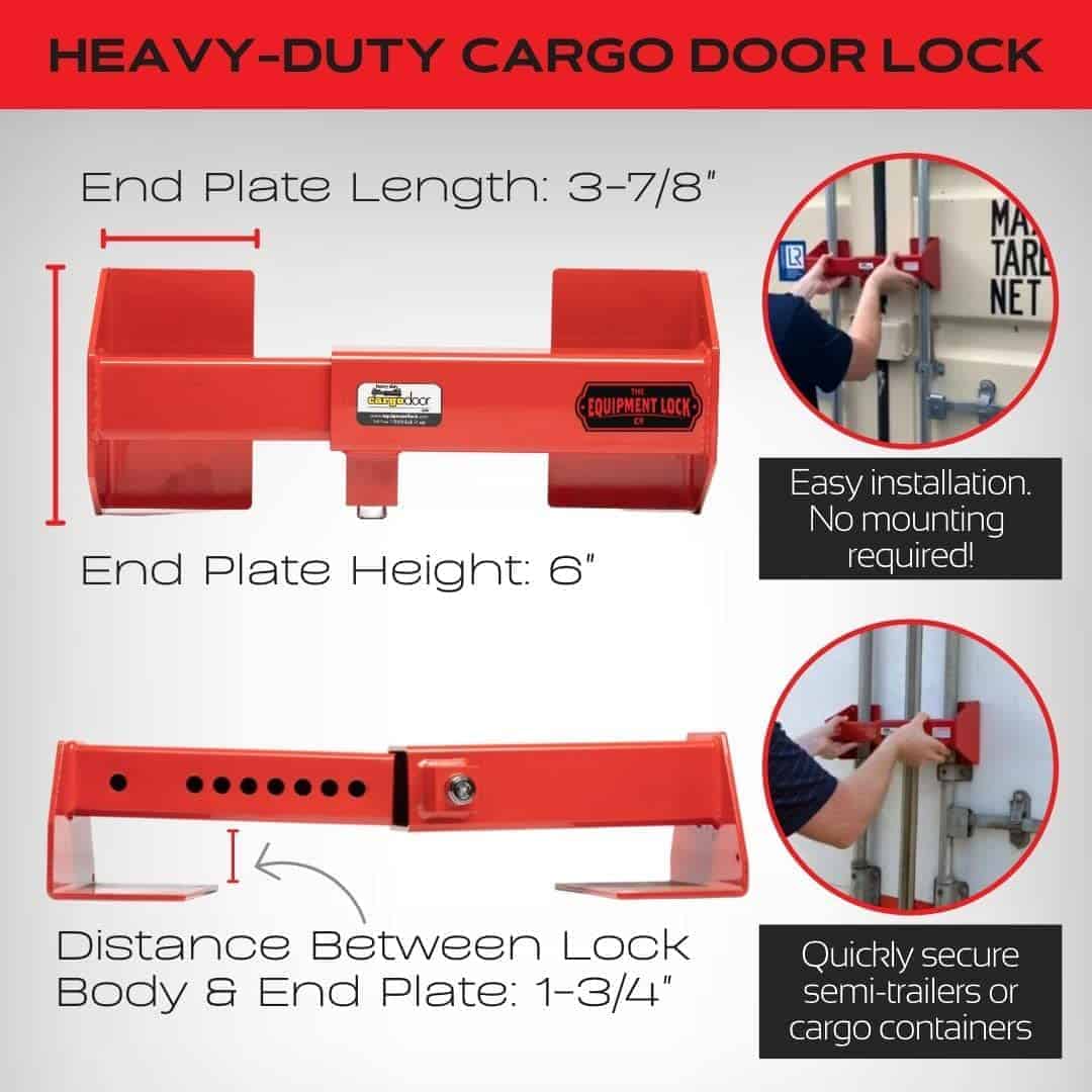 El bloqueo de puerta de carga de acero HDCDL de Equipamiento es un bloqueo ajustable con llave hecho de acero para asegurar ambas puertas de un semirremolque o contenedor de almacenamiento. Es ajustable para adaptarse a puertas con barras de bloqueo verticales de 9-3/4″ a 16″ de separación. El bloqueo está hecho de dos tubos cuadrados de acero, uno de 2″ y otro de 2-1/2″, con paredes de 3/16″ de espesor, que encajan juntos. El acero está recubierto en polvo de naranja para una gran visibilidad y para ayudar a resistir la corrosión. El bloqueo pesa 13 lb. y tiene placas de acero de 6″ de alto y 3/16″ de espesor que son perpendiculares a los tubos en sus extremos, y se encuentran contra las puertas de carga, para un soporte adicional.