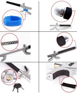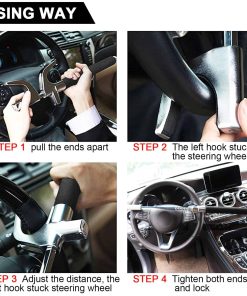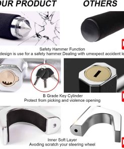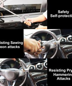 Bloqueo de volante Tevlaphee para coches, bloqueo de ruedas, bloqueo antirrobo de vehículos, abrazadera ajustable con doble gancho martillo de emergencia universal rompe ventanas autodefensa de alta seguridad. El bloqueo de volante se adapta a cualquier coche con un diámetro interno de volante de 6.6-12.5 pulgadas. Puede instalarse en la parte trasera del volante para que no descanse sobre la bolsa de aire. Para facilitar el estiramiento, no es necesario utilizar la llave, y cuando el bloqueo está inactivo, debido a la vibración, se estirará por sí solo, por lo que hemos equipado con un velcro azul mágico fijo. Viene con una cubierta de protección para evitar daños accidentales en el cristal. Úsalo para prevenir la ocurrencia de violencia es la intención original de nuestro diseño. Una herramienta de escape de seguridad para automóviles metálica para ayudar a prevenir el atrapamiento automotriz y romper la ventana para escapar con seguridad. Tu vida puede depender de este martillo para coche. Fabricado en acero redondo de alta calidad y aluminio de primera calidad para resistir el palanqueo, el aserrado, los martillazos y los ataques con freón. La precisa cerradura de doble resorte en forma de media luna con llave de codificación subtipo está especialmente diseñada para prevenir el robo profesional y la tasa de apertura mutua. Nuestro bloqueo tiene este robusto disuasivo físico y altamente visual para los ladrones de coches y es recomendado por policías y expertos en automóviles. Bloqueo de volante clásico de Tevlaphee. Mejor que otros competidores. Te proporcionamos 4 Pads Protectores, ¡otros NO! Deben causar daño o presión en tu volante. Te proporcionamos Hammer Cap, ¡otros NO! No puedes romper la ventana del coche o salvarte cuando ocurre una emergencia. Te proporcionamos Velcro Azul mágico, ¡otros NO! El Bloqueo no se puede almacenar o fijar correctamente y arañará tu coche. Dale a Tevlaphee la oportunidad de ofrecerte seguridad a ti y a tu coche. Servicio al Cliente Amigable. Antes de usarlo mejor, por favor aplica una pequeña cantidad de lubricante en el cilindro del bloqueo por ti mismo. Si tienes alguna otra pregunta, por favor contacta al equipo de Tevlaphee, te responderemos lo antes posible y te proporcionaremos una solución satisfactoria!