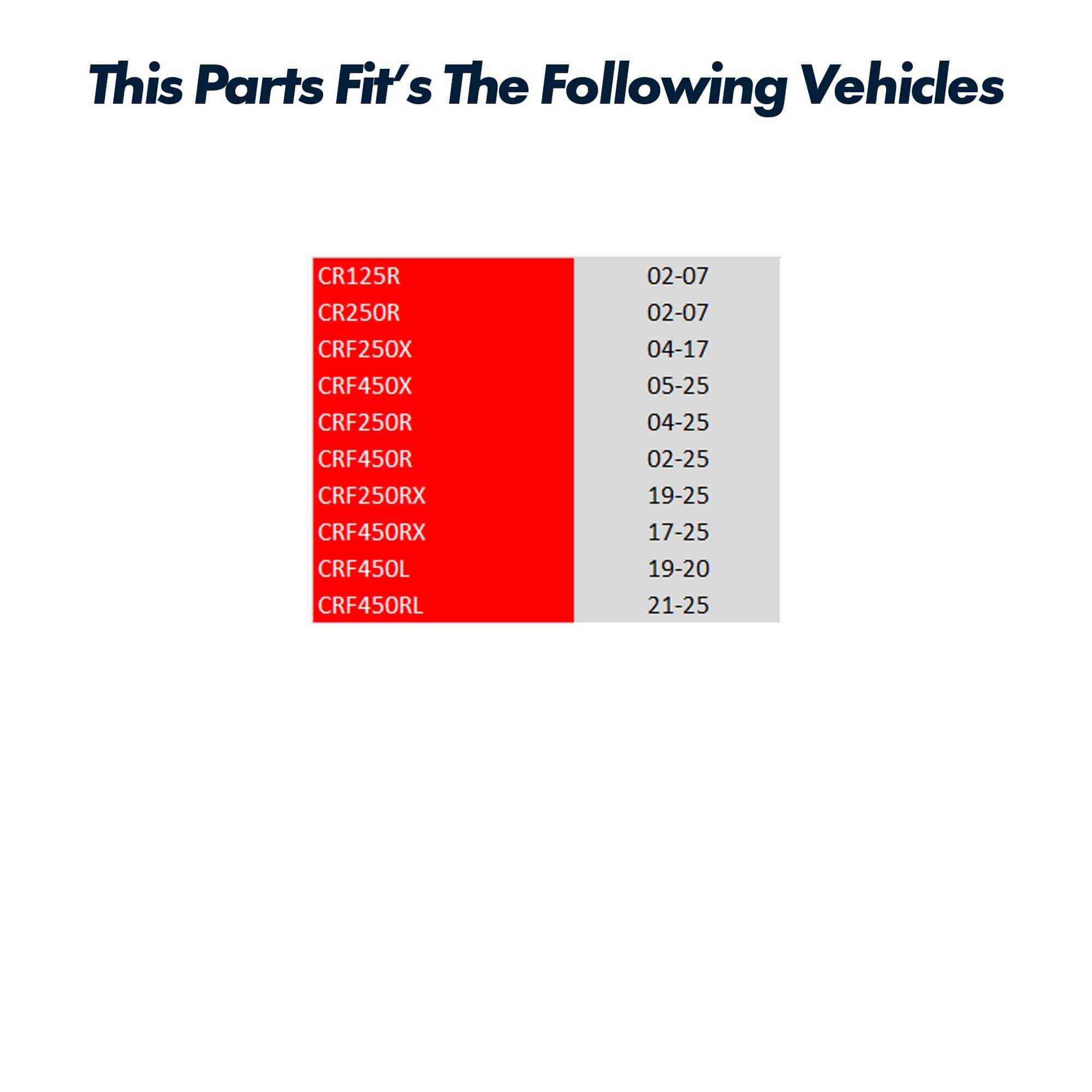 1. Compatible con Honda CR125R CR250R (2002 – 2007) / CRF250X (2004 – 2017) / CRF450X (2005 – 2025) / CRF250R (2004 – 2025) / CRF250RX (2019-2025) / CRF450R (2002 – 2025) / CRF450RX (2017 – 2025) / CRF450L (2019 – 2020) / CRF450RL (2021-2025) / CRF450RL (2021-2025).