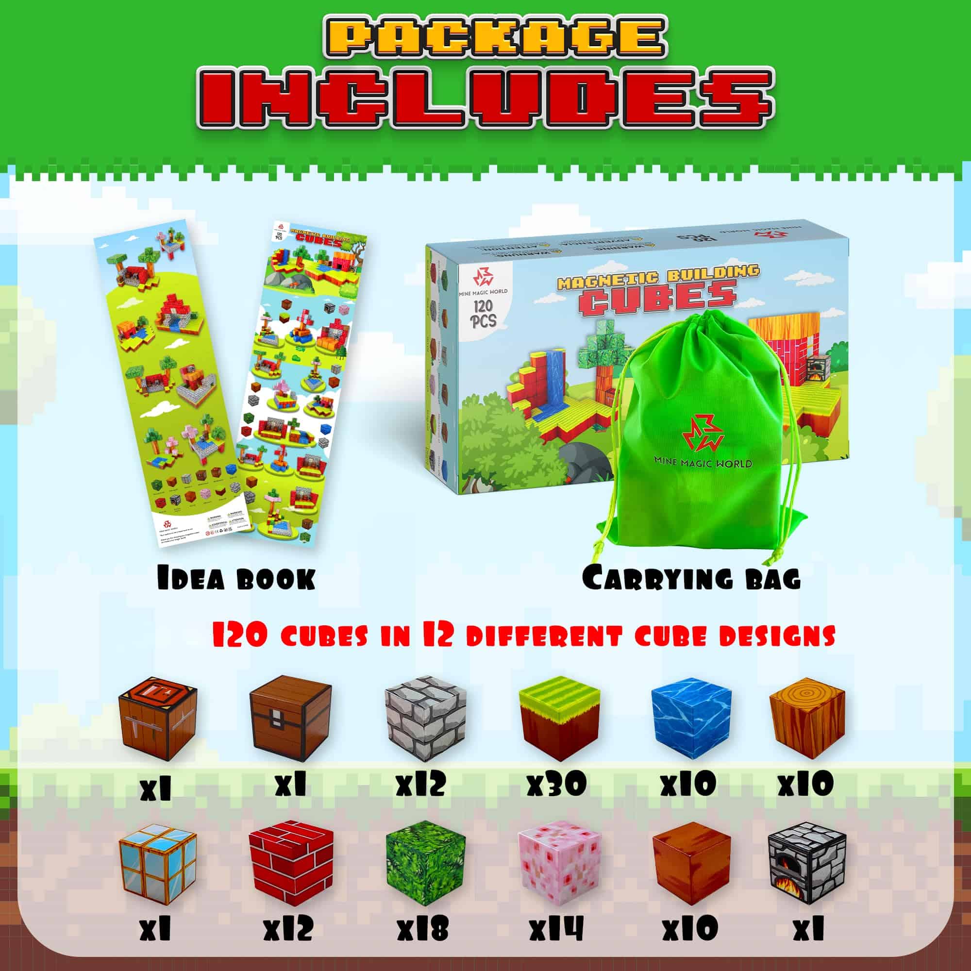 1. Aprender y Construir es Divertido: Cada caja incluye una variedad de 120 cubos magnéticos, mostrando una colección diversa de 12 diseños de cubos distintos, colores vivos, bolsa variada y libro de ideas de inicio rápido.