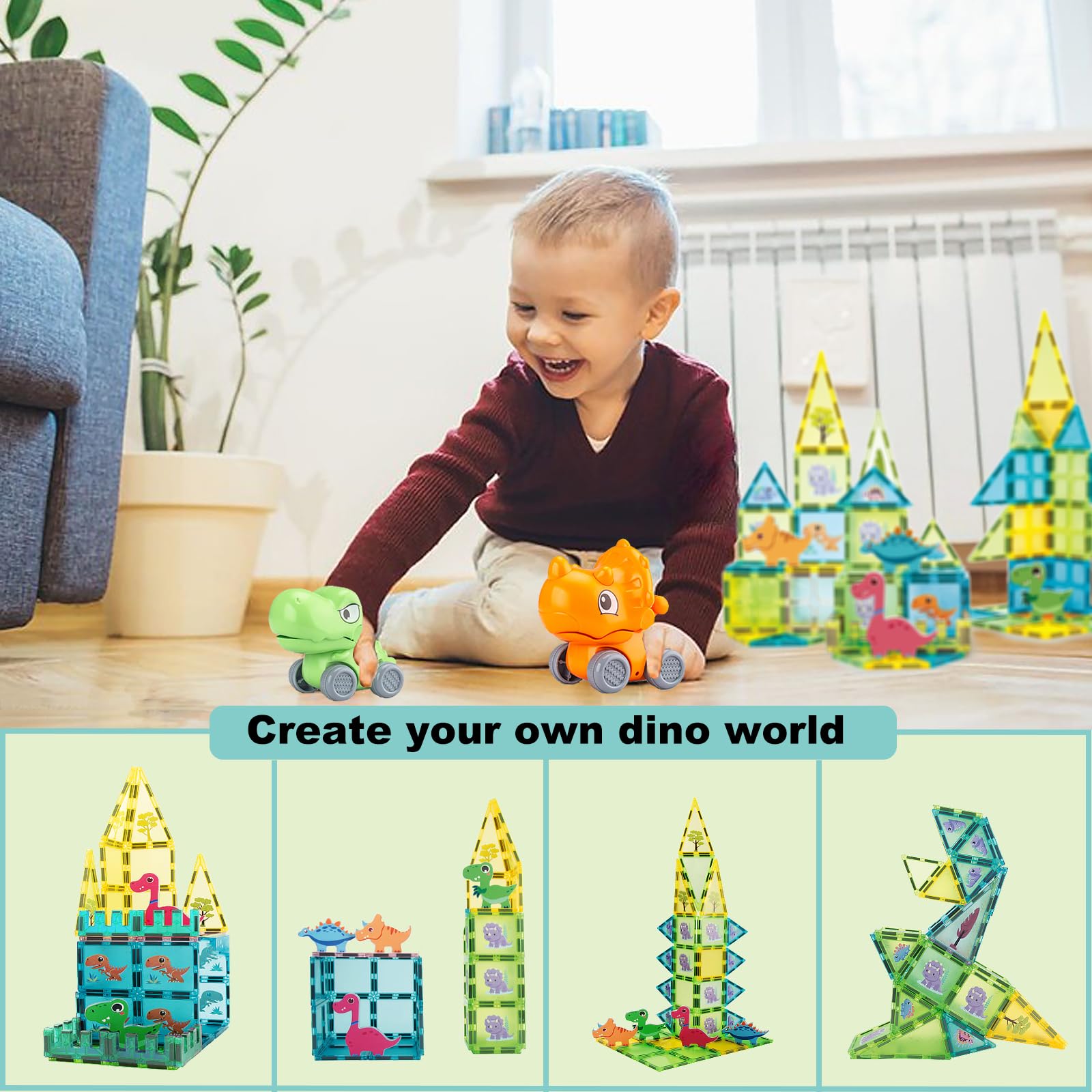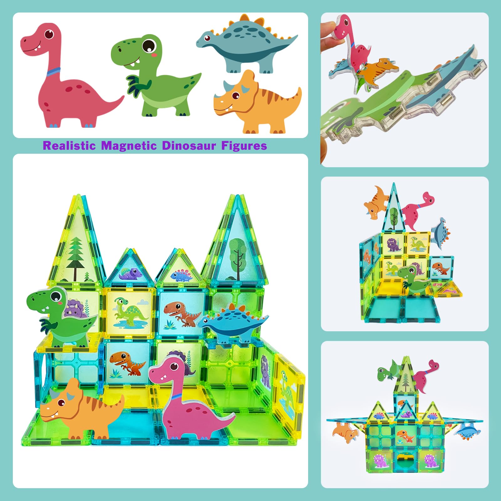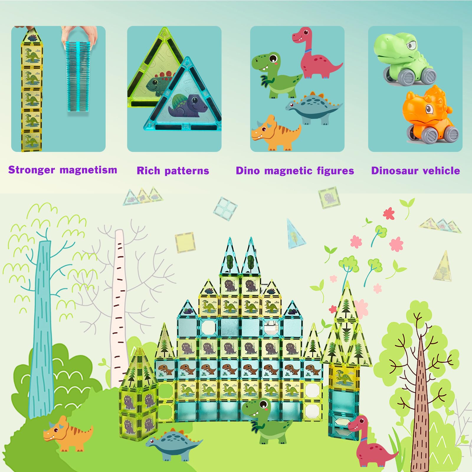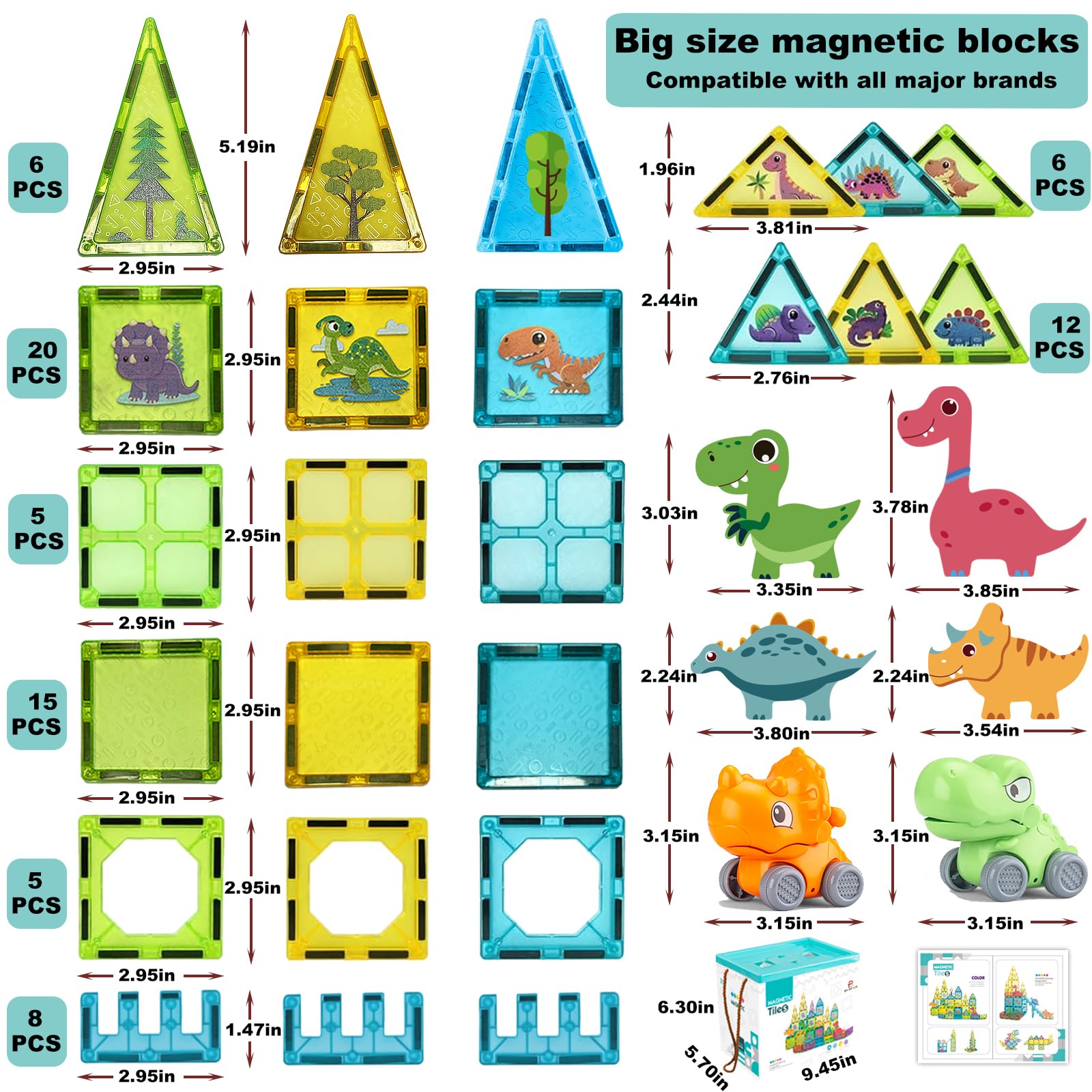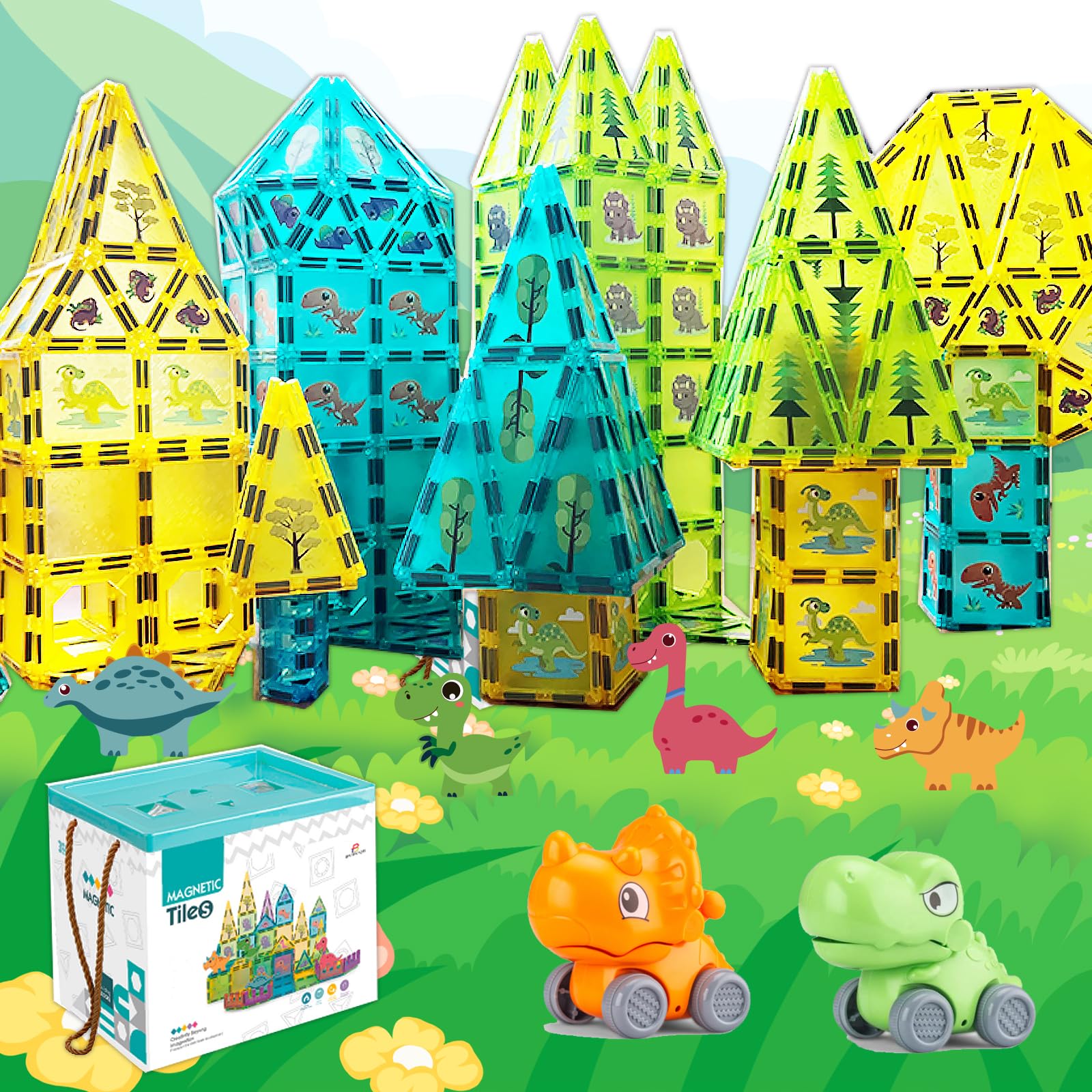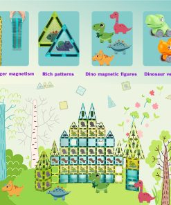 Explora el mundo prehistórico con nuestro set de bloques magnéticos temáticos de dinosaurios, que presentan encantadoras impresiones de dinosaurios que te transportan de vuelta a la era de los dinosaurios. Sumérgete en historias fascinantes y las reglas de la selva, creando un ambiente armonioso y aventurero. Los bloques magnéticos BUBUQE cuentan con un fuerte y estable magnetismo, lo que permite una construcción fácil y estable. Sigue las instrucciones para diseños simples o intrincados o deja que la creatividad de tu hijo vuele libremente mientras los pequeños dinosaurios se mantienen firmemente en los bloques. Completo con dos adorables figuras deslizantes de dinosaurios, estos bloques brindan movimiento y emoción, permitiendo a los niños pasear por el parque forestal de dinosaurios en sus imaginaciones. Este juguete de apilamiento de imanes perfecto es una valiosa herramienta educativa que promueve el razonamiento espacial, las habilidades motoras finas y la creatividad. También presenta a los niños conceptos básicos de ingeniería y fomenta el juego imaginativo, convirtiendo el aprendizaje en una experiencia divertida y atractiva. Empaquetado en una hermosa caja, perfecta para el almacenamiento y la entrega de regalos, nuestro set fomenta buenos hábitos organizativos y es un regalo ideal para las vacaciones como Navidad, cumpleaños y Halloween. Los Bloques Magnéticos BUBUQE están hechos de plástico ABS de alta calidad, no tóxico y libre de BPA. Los bordes de los bloques son redondeados y seguros para que los niños los manipulen. El tamaño de los bloques es adecuado para manos pequeñas y los niños pueden manejarlos fácilmente. Nuestro producto ha pasado una prueba de laboratorio estándar ASTM y se ha encontrado adecuado para niños pequeños. Nos esforzamos por proporcionar productos impecables y un servicio al cliente perfecto. Si hay algún problema de calidad, no te preocupes, asumiremos toda la responsabilidad y te daremos soluciones satisfactorias.