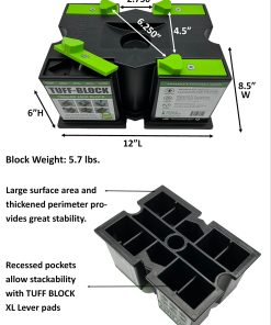 Con una capacidad de peso de hasta 10,000 libras, los TUFF-BLOCKS son robustos y confiables. Sus dimensiones de 12 pulgadas de largo, 8.5 pulgadas de ancho y 6 pulgadas de alto lo convierten en una solución conveniente para evitar el movimiento no deseado. Además, son fáciles de transportar gracias a los prácticos agujeros para los dedos.