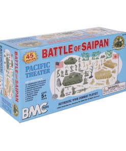 De la SERIE DE COLECCIONISTAS DE SOLDADOS DE JUGUETE CLÁSICOS DE BMC Toys, una feroz batalla que marcó un punto de inflexión en el teatro de guerra del Pacífico: El conjunto de 45 piezas de soldados de plástico de la Segunda Guerra Mundial BATTLE OF SAIPAN contiene 13 soldados de los Estados Unidos, 2 Tanques Sherman y 4 armamentos pesados en Verde OD. Las piezas de color Tan incluyen 12 soldados japoneses, 2 Tanques Chi-Ha y 4 armamentos pesados. El set también incluye 3 árboles de la jungla verdes y frondosos, un árbol desnudo negro carbón, 2 rocas grises y 2 banderas. Los tanques cuentan con torretas que giran y los cañones de los tanques Sherman se elevan. Las figuras tienen aproximadamente una escala de 1:32 y están hechas de plástico blando. Los vehículos y accesorios están hechos de plástico rígido y van desde una escala de 1:38 a 1:32.