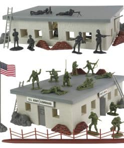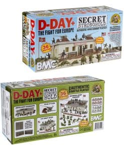 Parte de la serie AMERICAN HERO COLLECTOR de BMC Toys, esta caja de juego de 36 piezas de soldados de plástico forma parte de la mayor invasión en la historia militar: El D-DAY+ SECRET STRONGHOLD incluye un búnker 3 en 1, 11 soldados americanos en verde oliva, 10 soldados alemanes en negro, 2 cañones antiaéreos Flak 37, 2 escaleras, 2 banderas, 2 formaciones rocosas, 1 mortero, 1 sección de alambrada y 4 montones de sacos de arena.