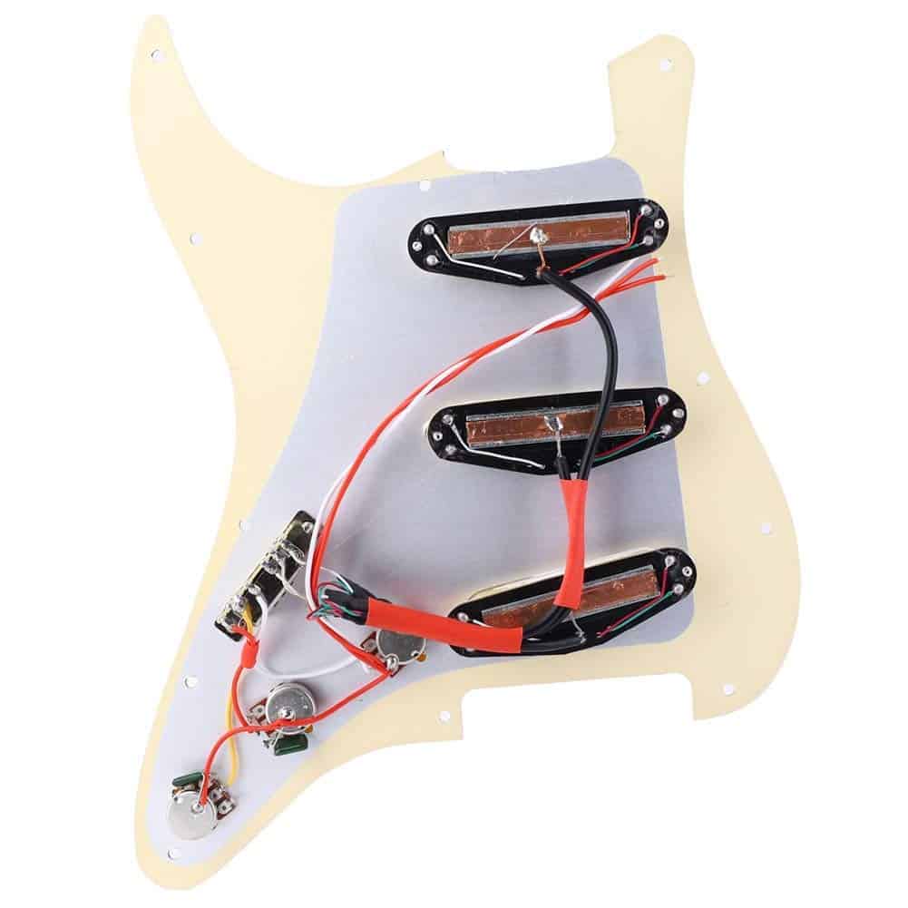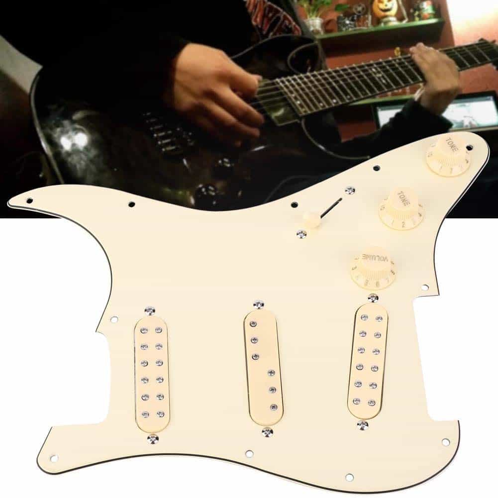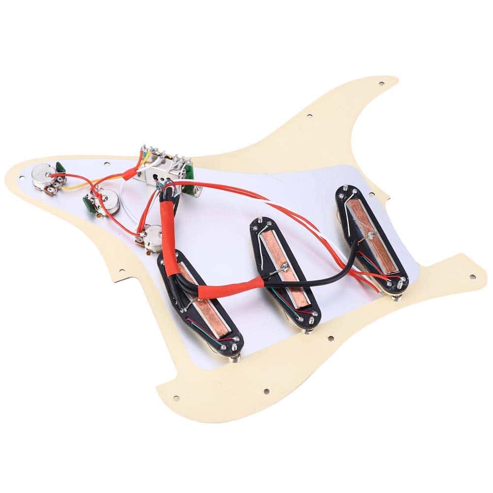 Característica: 1. Tiene tres pastillas dobles para producir un sonido clásico y hermoso. 2. El panel está hecho de 3 capas de PVC, que puede proteger mejor tu guitarra. 3. El interruptor es un interruptor de cinco vías, el cableado es un control de volumen y dos controles de tono. 4. Todo lo que tienes que hacer es soldar el zócalo de entrada y estar listo para tocar. 5. Hecho de material de metal y plástico de alta calidad, resistente, duradero y con una larga vida útil. Especificación: Condición: 100% Nuevo Tipo de Artículo: Pickguard de Guitarra Eléctrica Modelo: SSS29 Material: Metal + Plástico Color: Beige Pastilla de Mástil: 8.5-9.0K Pastilla Media: 8.5-9K Pastilla de Puente: 8.5-9K Peso: Aprox. 634g Tamaño del paquete: Aprox. 34x27x6cm/13.39×10.63×2.36pulg. Lista de Paquetes: 1 x Pickguard Precableado para Guitarra Eléctrica 12 x Tornillo de Instalación