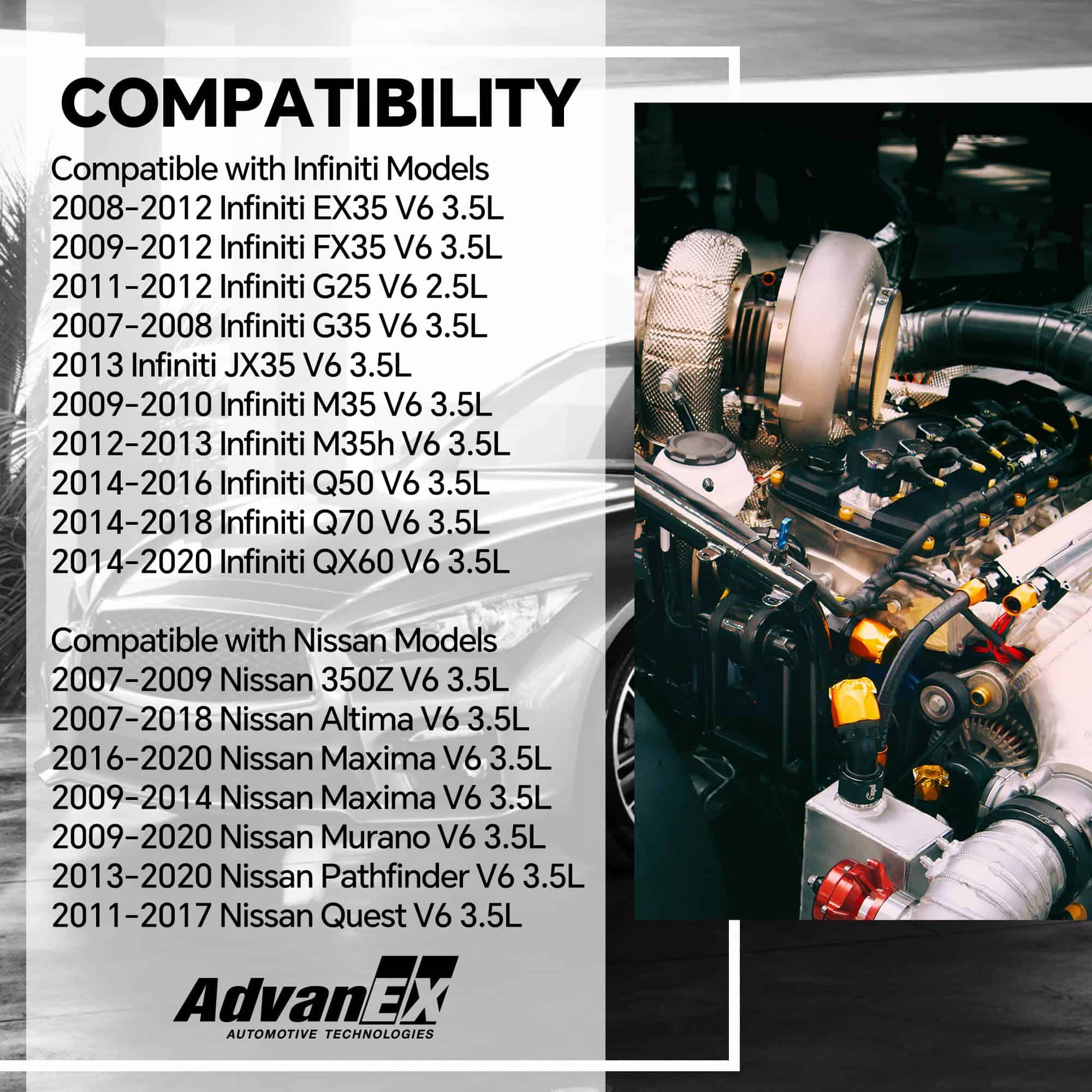 1. Compatibilidad: Compatible con Infiniti EX35, FX35, G25, G35, JX35, M35, M35h, Q50, Q70, QX60, V6 3.5L. Compatible con Nissan 350Z, Altima, Maxima, Murano, Pathfinder, Quest, V6 3.5L.