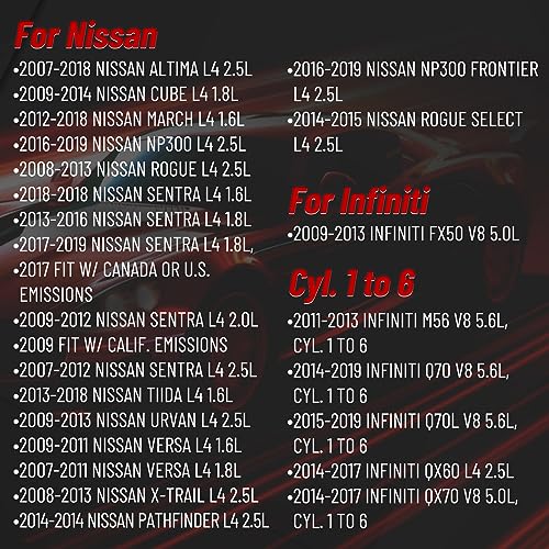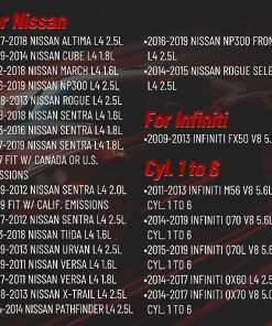 2. Modelos aplicables compatibles con 2009 – 2013 Infiniti FX50 5.0L/5.6L V8, 2011 – 2013 Infiniti M56 5.0L/5.6L V8, 2014 – 2019 Infiniti Q70 5.0L/5.6L V8, 2015 – 2019 Infiniti Q70L 5.0L/5.6L V8, 2014 – 2017 Infiniti QX70 5.0L/5.6L V8, 2014 – 2017 Infiniti QX60 2.5L L4. Utilice la función «el fabricanteconfirmfit» en la parte superior de la página para buscar más modelos compatibles.