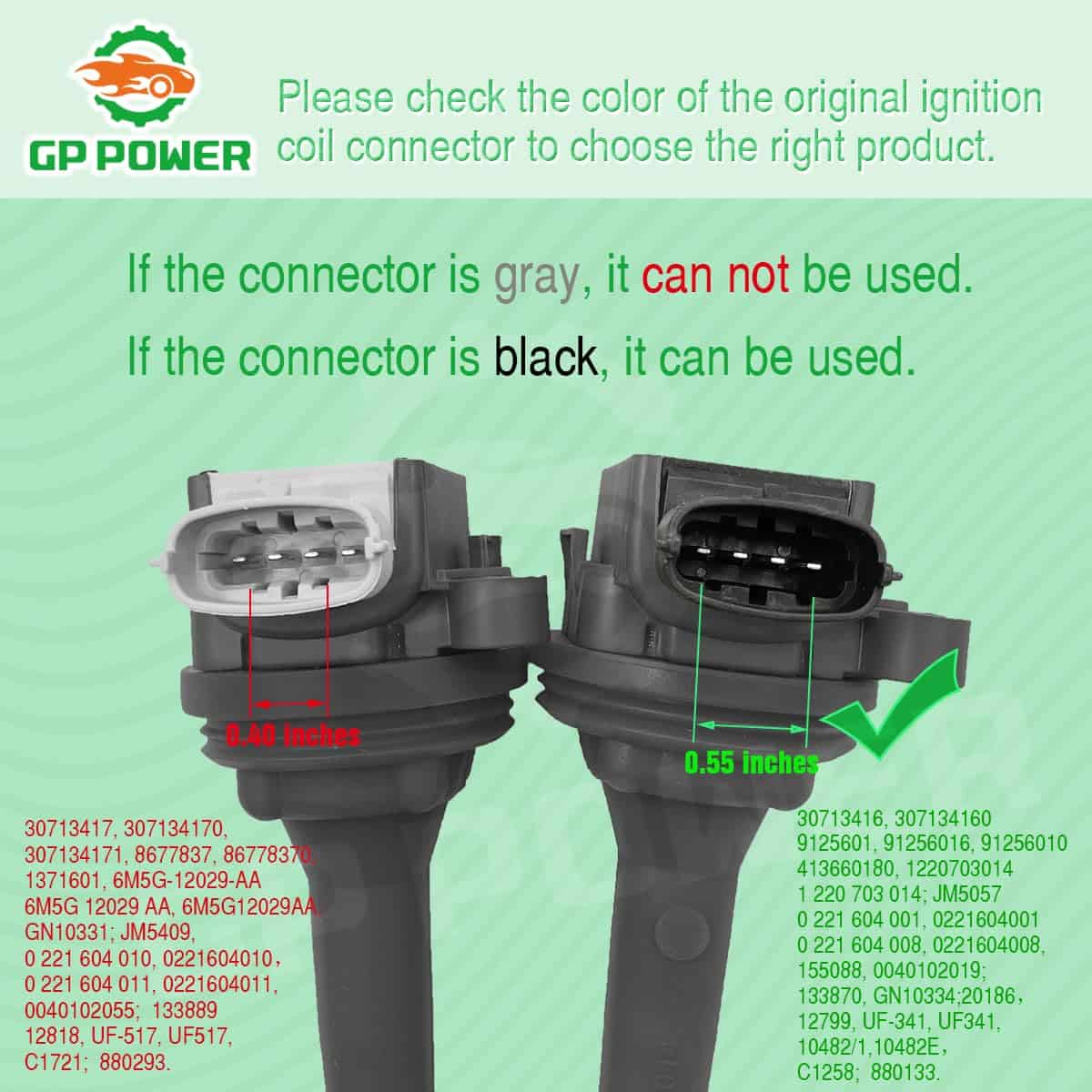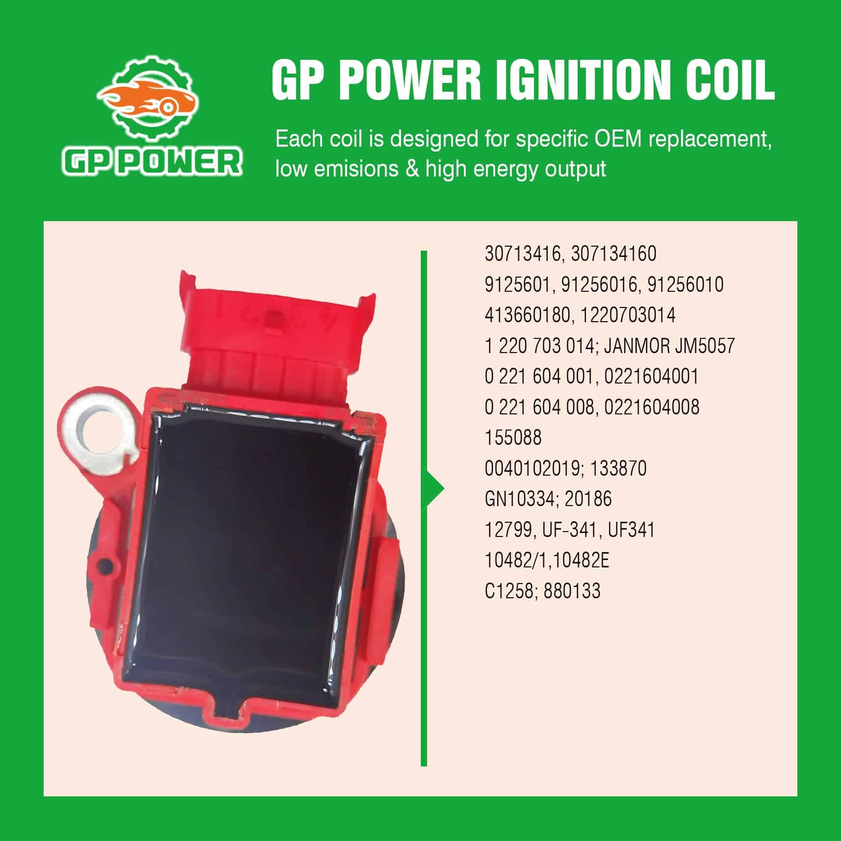 GP POWER Ignition Coils siempre están hechas con cobre de alta calidad, diseñadas para una aplicación específica y probadas en carretera. Por favor, revise cuidadosamente la información a continuación para asegurarse de que esta pieza sea compatible con su vehículo.