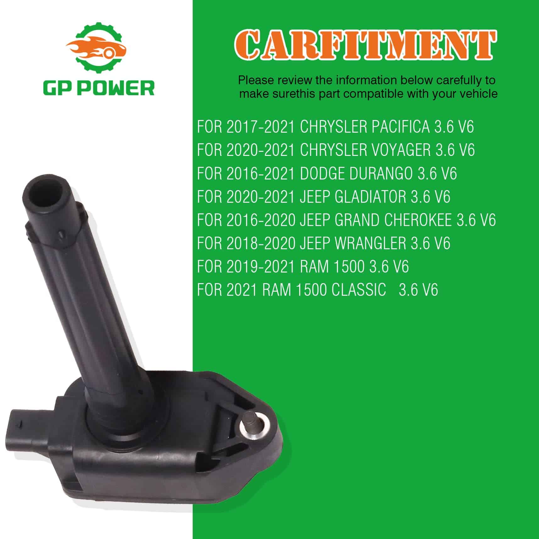 1. Las bobinas de encendido GP POWER UF807 UF-807 son un conjunto de 6 bobinas de encendido de repuesto compatible con los vehículos Chrysler Pacifica, Voyager, Dodge Durango, Jeep Gladiator, Grand Cherokee, Wrangler y Ram 1500 con motor 3.5 V6. Estas bobinas de encendido están fabricadas con cobre de alta calidad para garantizar una excelente durabilidad y rendimiento.