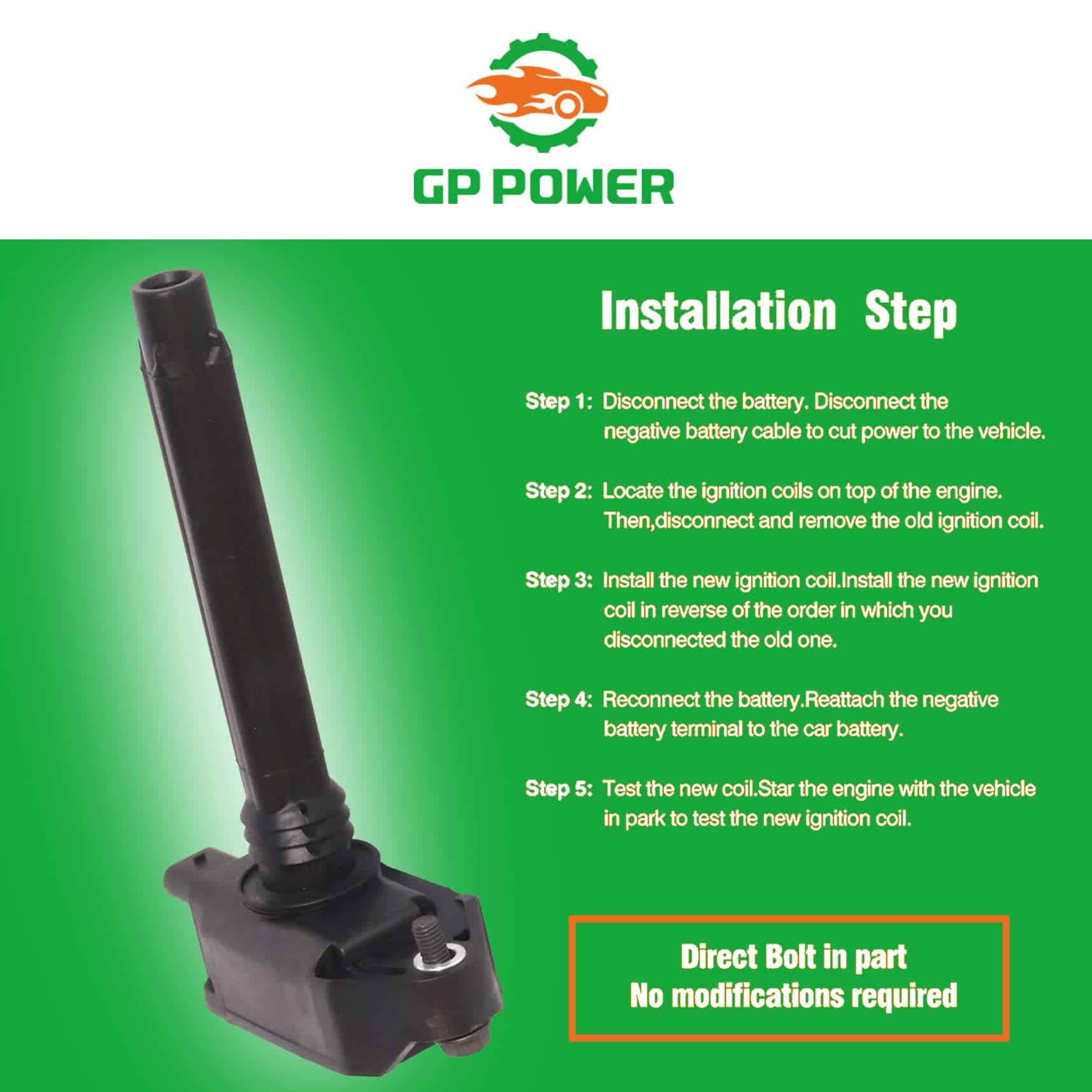 3. Al instalar estas bobinas de encendido, experimentará arranques de motor más consistentes y suaves, lo que mejorará la eficiencia y el rendimiento de su vehículo. Las bobinas de encendido GP POWER son un reemplazo directo en la ubicación de fábrica y reemplazan el número de pieza del equipo original para una fácil instalación.