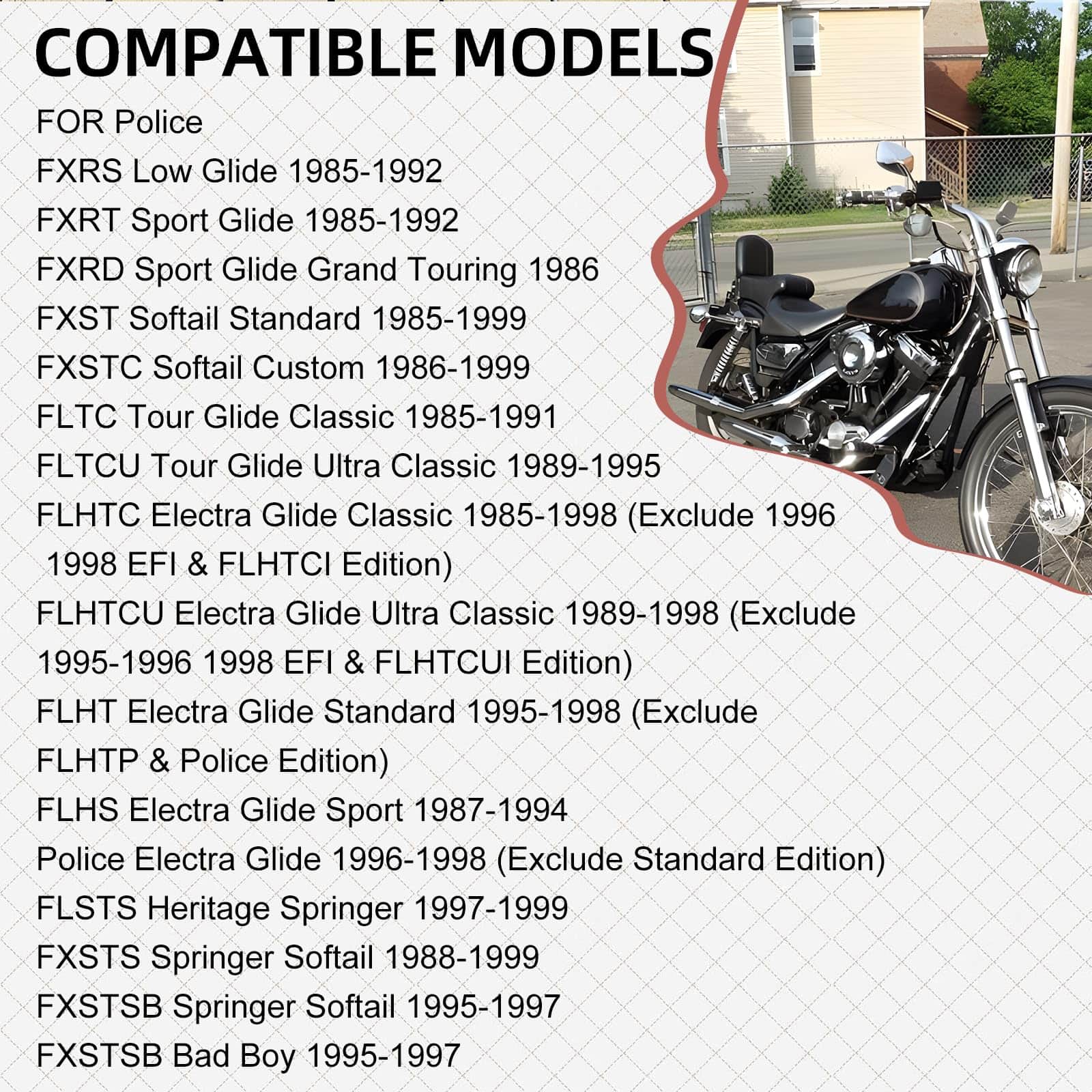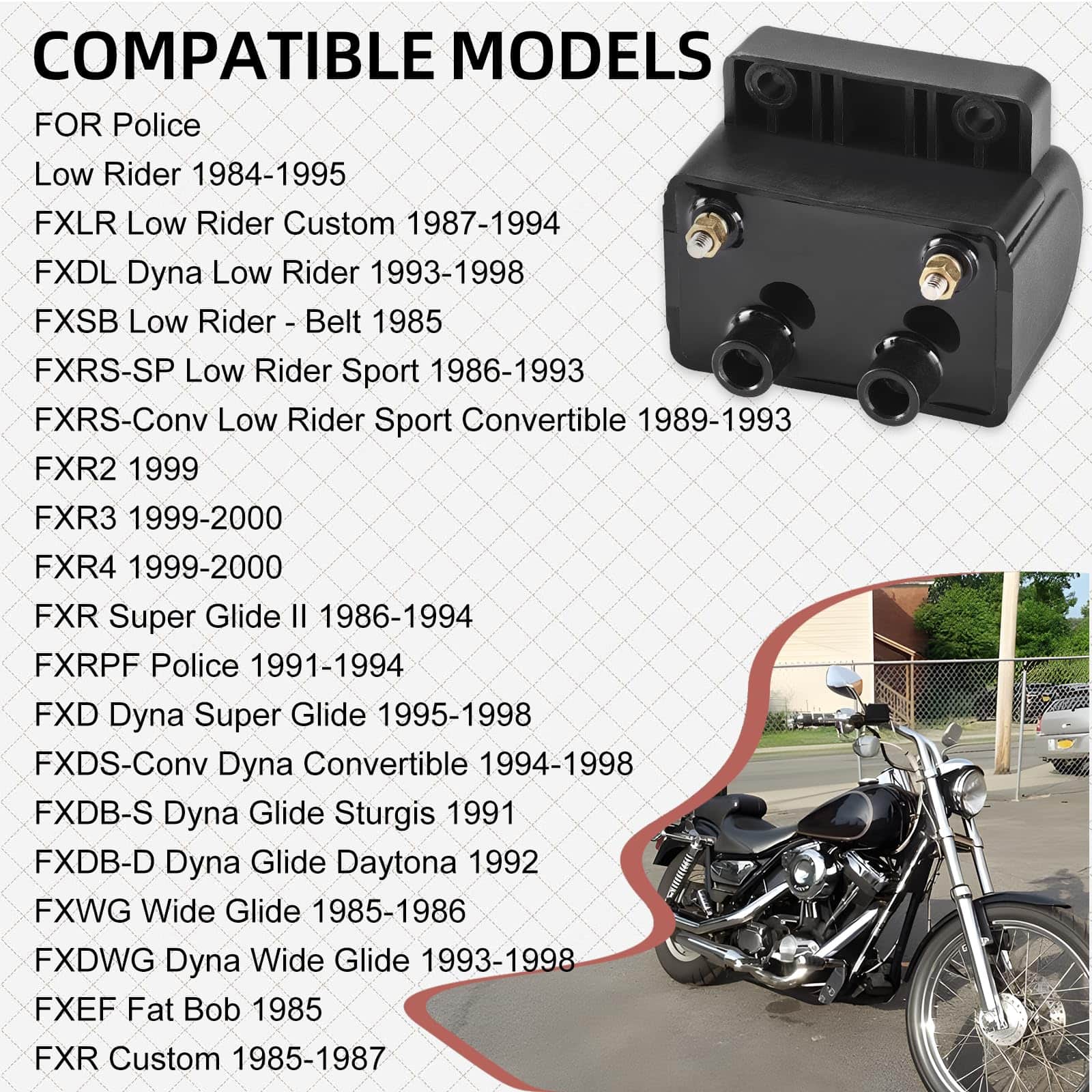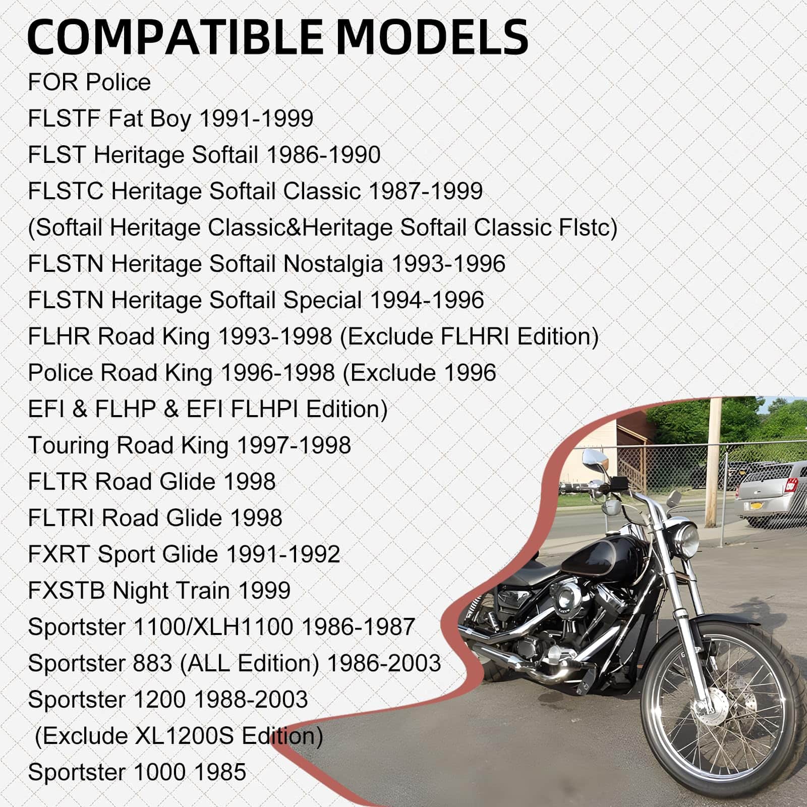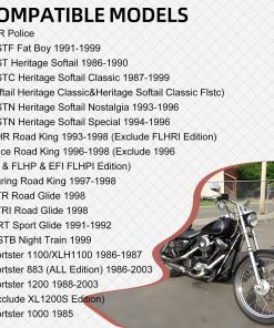 2. COMPATIBILIDAD AMPLIA: Este producto es compatible con una variedad de modelos Harley Davidson fabricados entre 1984 y 2003. Algunos de los modelos incluidos son Police Low Rider, FXLR Low Rider Custom, FXDL Dyna Low Rider, FXSB Low Rider – Belt, FXRS-SP Low Rider Sport, entre otros.