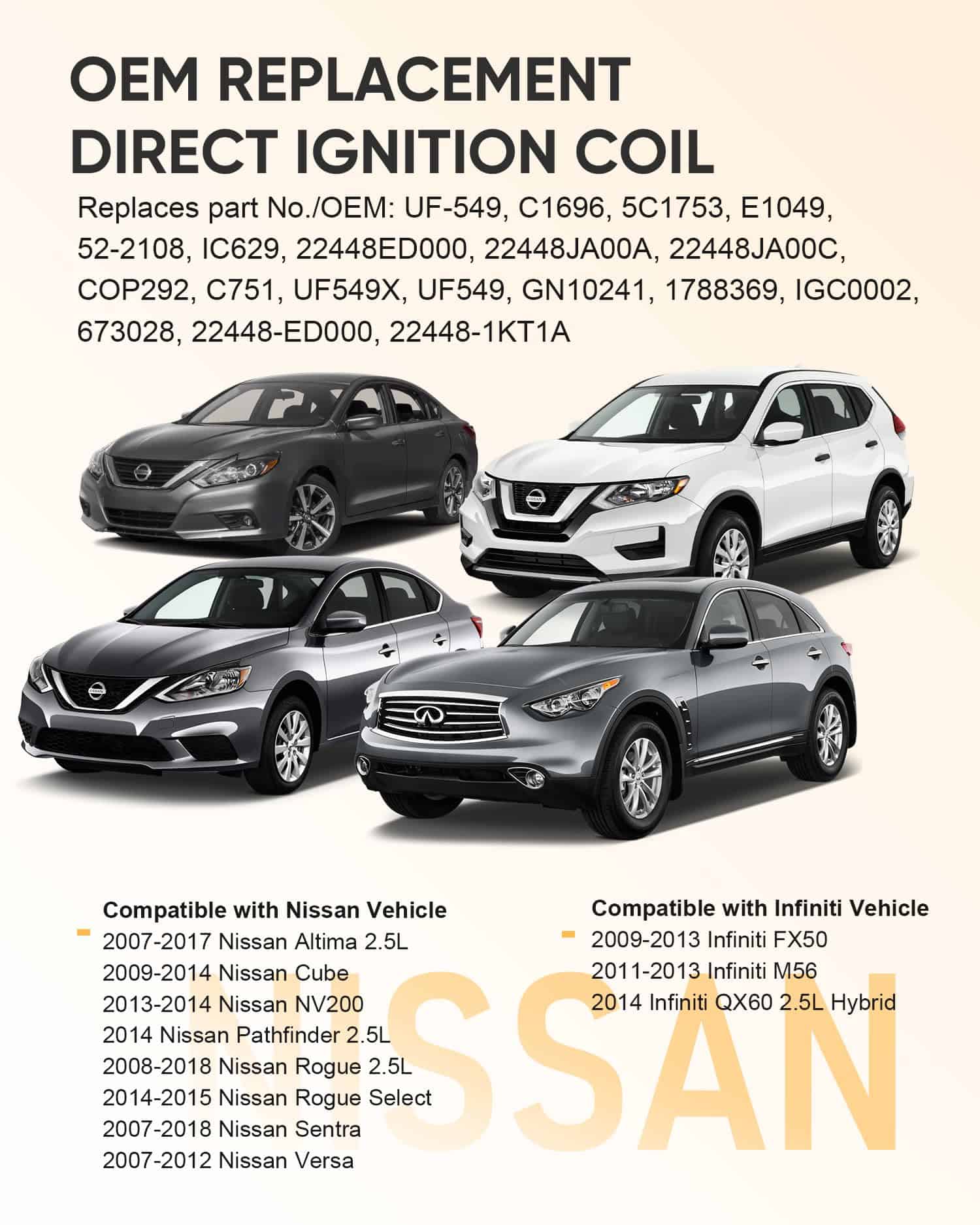 3. Vehículos compatibles: Apto para Vehículos Nissan e Infiniti; 2009 – 2013 FX50 | 2011 – 2013 M56 | 2007 – 2017 Altima 2.5L | 2009 – 2014 Cube | 2013 – 2014 NV200 | 2008 – 2018 Rogue 2.5L, 2.0L | 2007 – 2018 Sentra 2.5L, 1.8L y 1.6L Turbo.