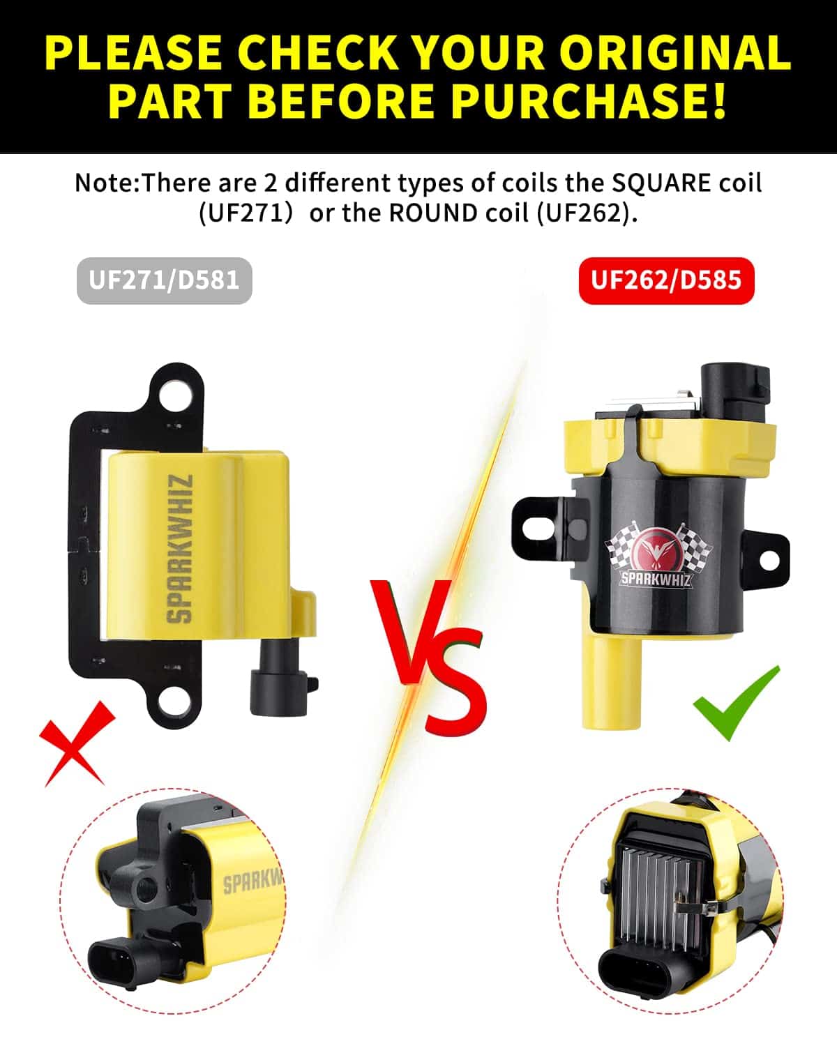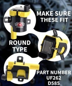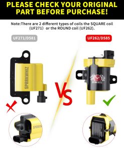 ¡ATENCIÓN POR FAVOR – Hay 2 tipos diferentes de bobinas, la bobina de cuerpo redondo UF262 y la bobina de cuerpo cuadrado UF271, lo cual puede causar confusiones en su parte, haciéndole elegir la opción equivocada involuntariamente. Por favor, use la barra desplegable de año/marca/modelo y los números de parte intercambiables para confirmar la compatibilidad. O simplemente revise sus bobinas originales para asegurarse si necesita la bobina de estilo redondo o cuadrado. ¿Tiene alguna pregunta? Por favor, contáctenos por correo electrónico. Responderemos en un máximo de 12 horas.