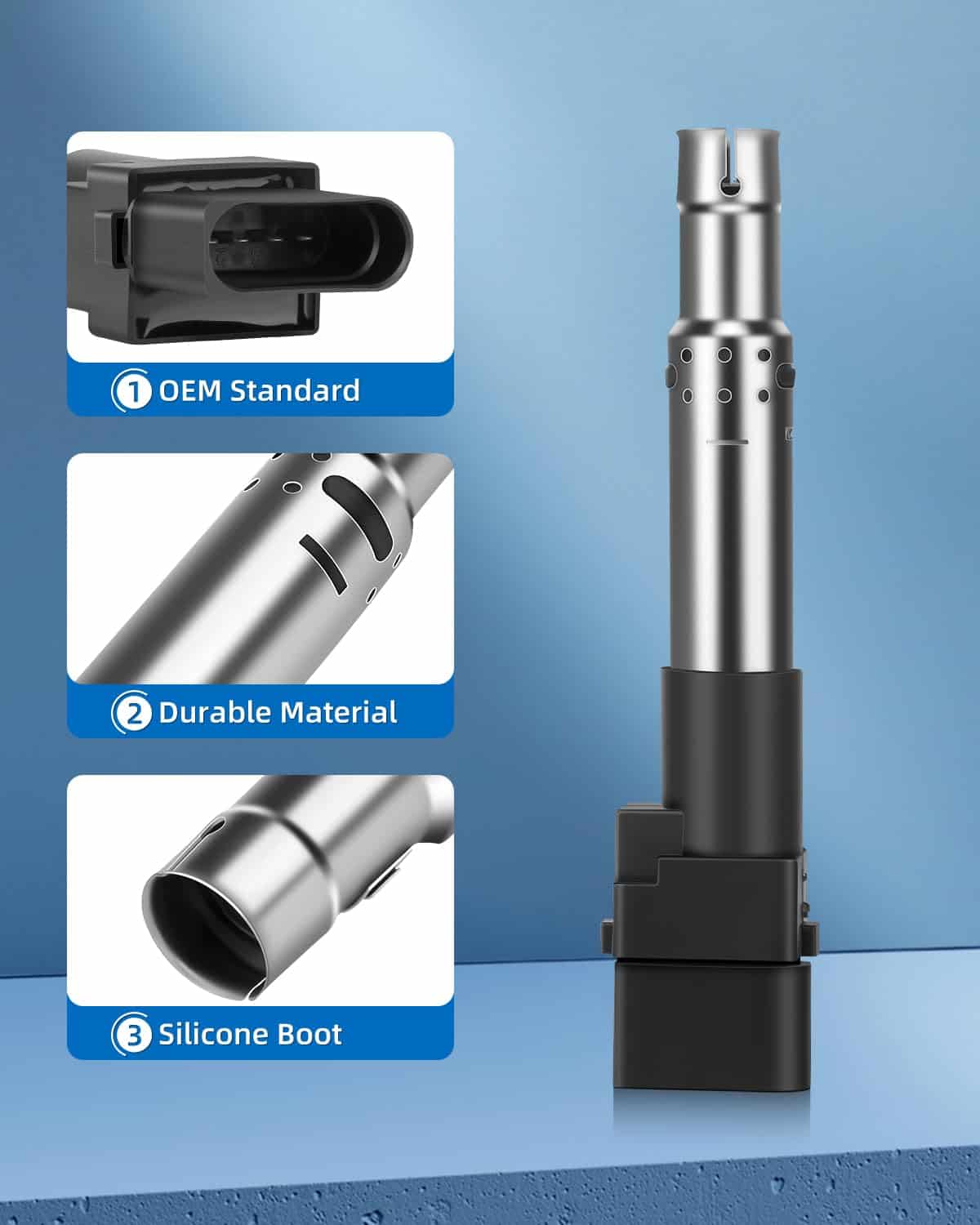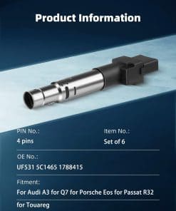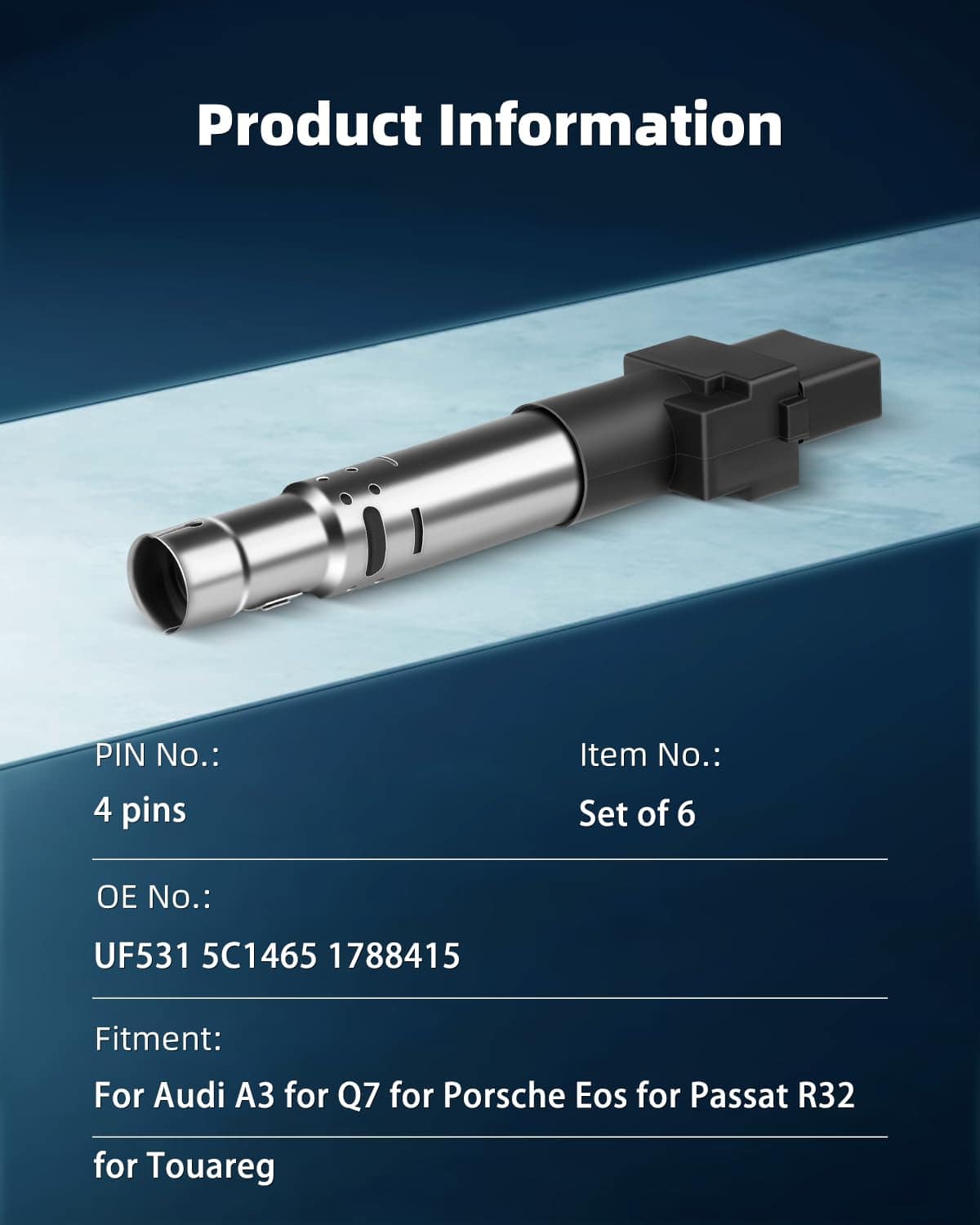 Compatibilidad: AUDI A3 (2006 – 2008), AUDI Q7 (2007 – 2008), AUDI TT (2004 – 2008), PORSCHE CAYENNE (2004 – 2010), VOLKSWAGEN EOS (2007 – 2008), VOLKSWAGEN GOLF 2004, VOLKSWAGEN PASSAT (2006 – 2008), VOLKSWAGEN R32 2008, VOLKSWAGEN TOUAREG (2004 – 2008). Empaquetado Incluido: 6 bobinas de encendido. Nota: Revise la información anterior cuidadosamente para asegurarse de que esta pieza se ajuste a su vehículo.