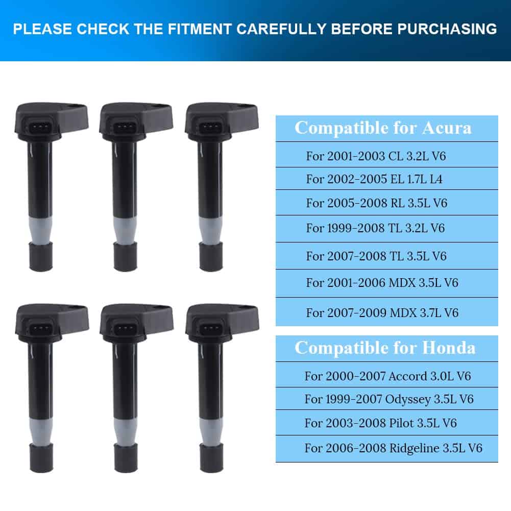 Bobinas de Encendido JDMON Compatible con Honda Accord Odyssey Pilot Ridgeline Acura MDX TL RL CL 3.0L 3.2L 3.5L V6 1999-2009 – Reemplaza OEM #30520P8EA01 30520P8FA01 30520RCAA02 Paquete de 6 – Las bobinas de encendido JDMON son compatibles con una amplia gama de vehículos Honda y Acura, cubriendo modelos como Accord, Odyssey, Pilot, Ridgeline, CL, EL, RL, TL y MDX. Estas bobinas están diseñadas para ofrecer un ajuste exacto y una larga vida útil, gracias a materiales resistentes al calor y recubrimientos protectores. Reemplace sus bobinas de encendido OEM con este paquete de 6 bobinas de alta calidad de JDMON para mantener su vehículo funcionando de manera óptima. Asegúrese de verificar la compatibilidad antes de realizar la compra y se recomienda la instalación por un mecánico profesional para garantizar un trabajo correcto y seguro.