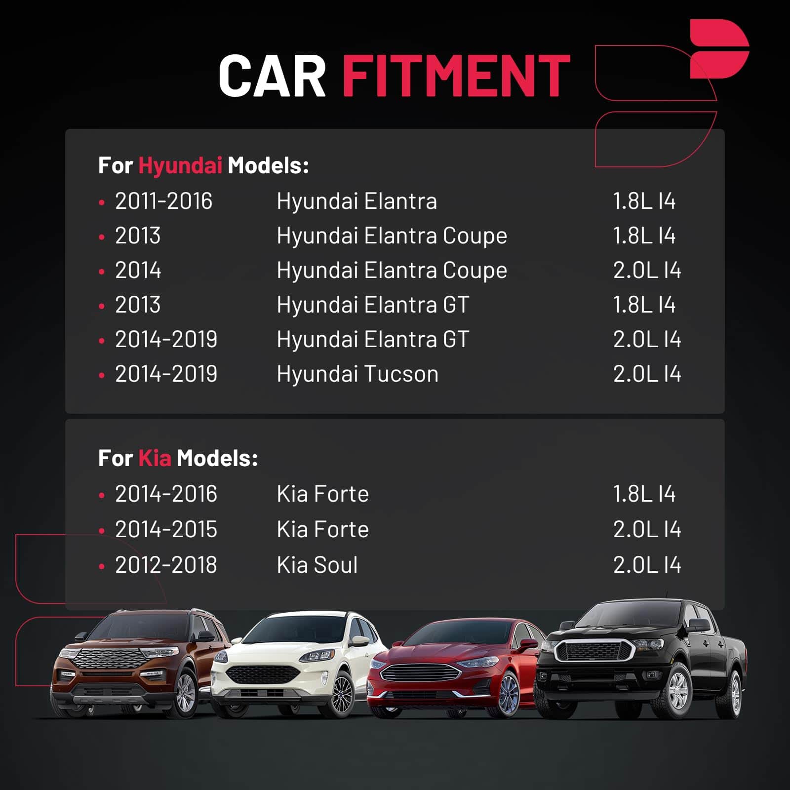 3. Verifique la compatibilidad en base al año, marca, modelo de su vehículo y el número OE de las piezas de repuesto. Compatible con: 2011-2016 Hyundai Elantra Coupe GT, 2014-2019 Hyundai Tucson, 2014-2016 Kia Forte Soul, etc. Más información en las imágenes o en la página de detalles.