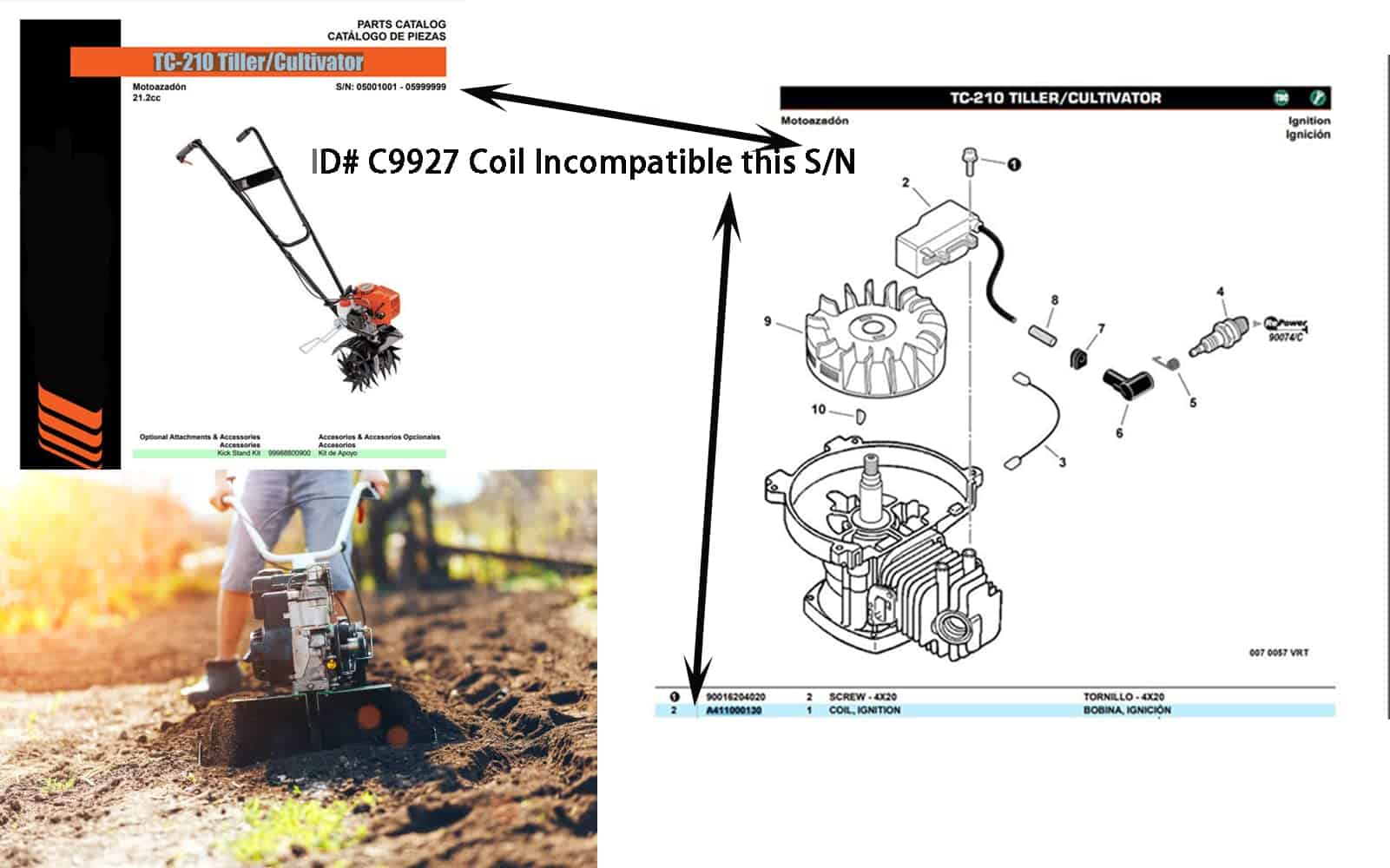 No es compatible con este modelo: Cultivador Tiller TC-210 – S/N: 05001001 – 05999999 este módulo de ignición del motor: A411000130, A411000131