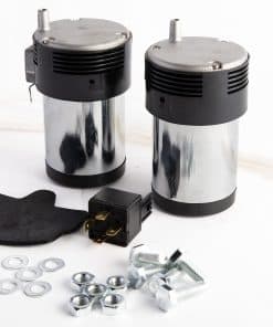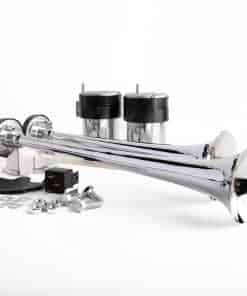Bocina de Aire de trompetas dobles. Producirá un sonido de alta potencia de 129 dB. Las trompetas están cromadas. Bueno para camiones, autos, RV, SUV o botes. Viene con 2 compresores de aire de 12 voltios sin mantenimiento pesados, soportes de montaje, hardware, mangueras y relé. Se instala fácilmente en cualquier vehículo.