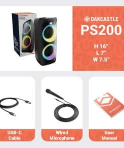 Eleva tus eventos con sus 80W de potencia máxima, entregando un sonido potente y claro para cualquier entorno. Disfruta de la iluminación dinámica que pulsa al ritmo de tu música, agregando una pantalla visual vibrante. Con capacidad de carga rápida y hasta 5 horas de reproducción ininterrumpida, esta bocina portátil recargable minimiza el tiempo de espera y maximiza la diversión, haciéndola ideal para presentaciones, fiestas y diversos eventos. El micrófono con cable incluido garantiza una proyección de voz confiable, facilitando la comunicación efectiva con tu audiencia. Ideal tanto para uso en interiores como en exteriores. Este paquete incluye: Bocina PS200, Cable USB-C, Micrófono con Cable y Manual de Usuario. Dimensiones del paquete: 7.5 x 7.7 x 16.8 in, 4.73 lb.