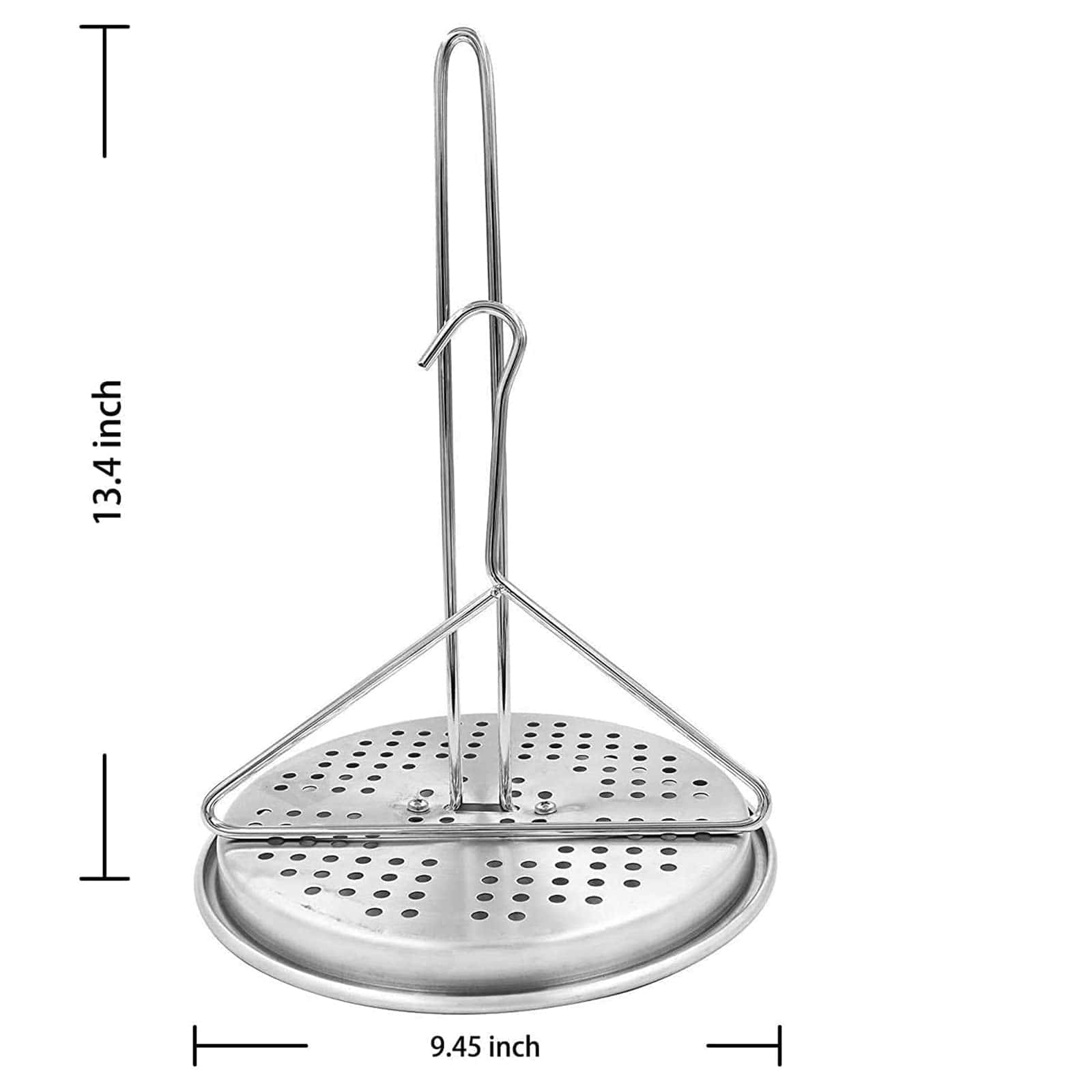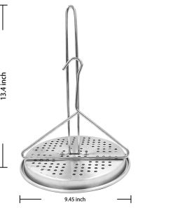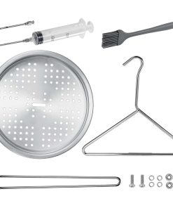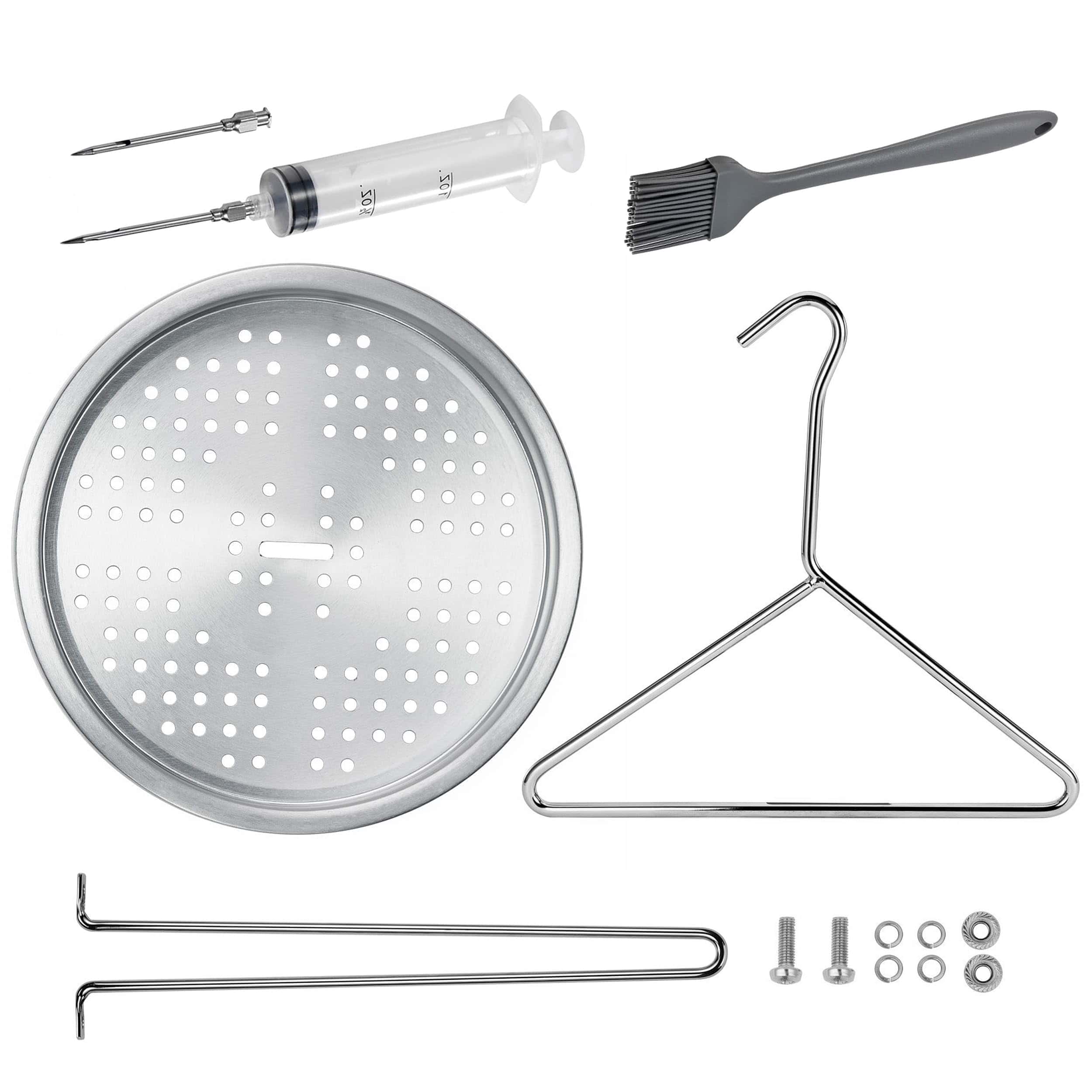 BOHK Perforated Aluminum Turkey Chicken Poultry Deep Frying Rack with Chrome Finish Wire Handle Lifter Hook Seasoning Injector Silicone Brush. Esta parrilla para pollo está hecha de aluminio de grado alimenticio (soporte), alambre con acabado cromado (mango y gancho elevador), acero inoxidable (pernos, tuercas, juntas), lo que la hace duradera, resistente al óxido, resistente al calor y no fácil de deformar. La base evita que los jugos de los alimentos se derramen en el horno o fuego sin manchar tu parrilla. La construcción sólida soporta hasta 16-18 libras de pollo sin deformación ni torsión a altas temperaturas. Peso máximo soportado: 18 libras (8,16 kg), Dimensiones de ensamblaje: 9.45 in x 9.45 in x 13.4 in (A). Excelentes accesorios para freír pavo, pollo, pato, pavo pequeño, urogallo, ganso de tamaño pequeño y muchos más tipos de aves de corral en la olla de freír, perfecto para que la carne salga jugosa y crujiente. El soporte perforado y elevado para aves de corral está diseñado para crear un flujo circular de aceite a través y alrededor de la cavidad al freír, evitando que el fondo de la freidora se queme. El paquete incluye: 1 x estante vertical, 1 x base de bandeja para goteo, 1 x gancho levantador, 1 x pincel de aceite, 1 x inyector de carne, pernos y tuercas, instrucciones en inglés. Fácil de limpiar, se puede lavar a mano o en el lavavajillas. Remojarlo en agua caliente durante unos 5 minutos antes de limpiarlo, luego ponerlo en el lavavajillas o enjuagarlo con agua. Ligero para transportar, fácil montaje y almacenamiento.
