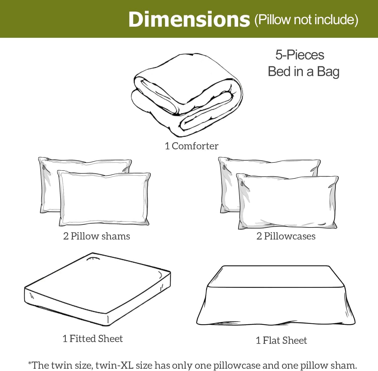 4. 5 PIEZAS JUEGO DE CAMA TWIN XL – incluye (1) 68″x92″ Edredón Twin/Twin XL, (1) 66″x102″ sábana plana, (1) sábana ajustable de 39 x 80 pulgadas con 13″ a 15″ de pared, (1) 20″x30″ Fundas de almohada estándar con lazos y (1) 20 x 30 pulgadas funda de almohada.