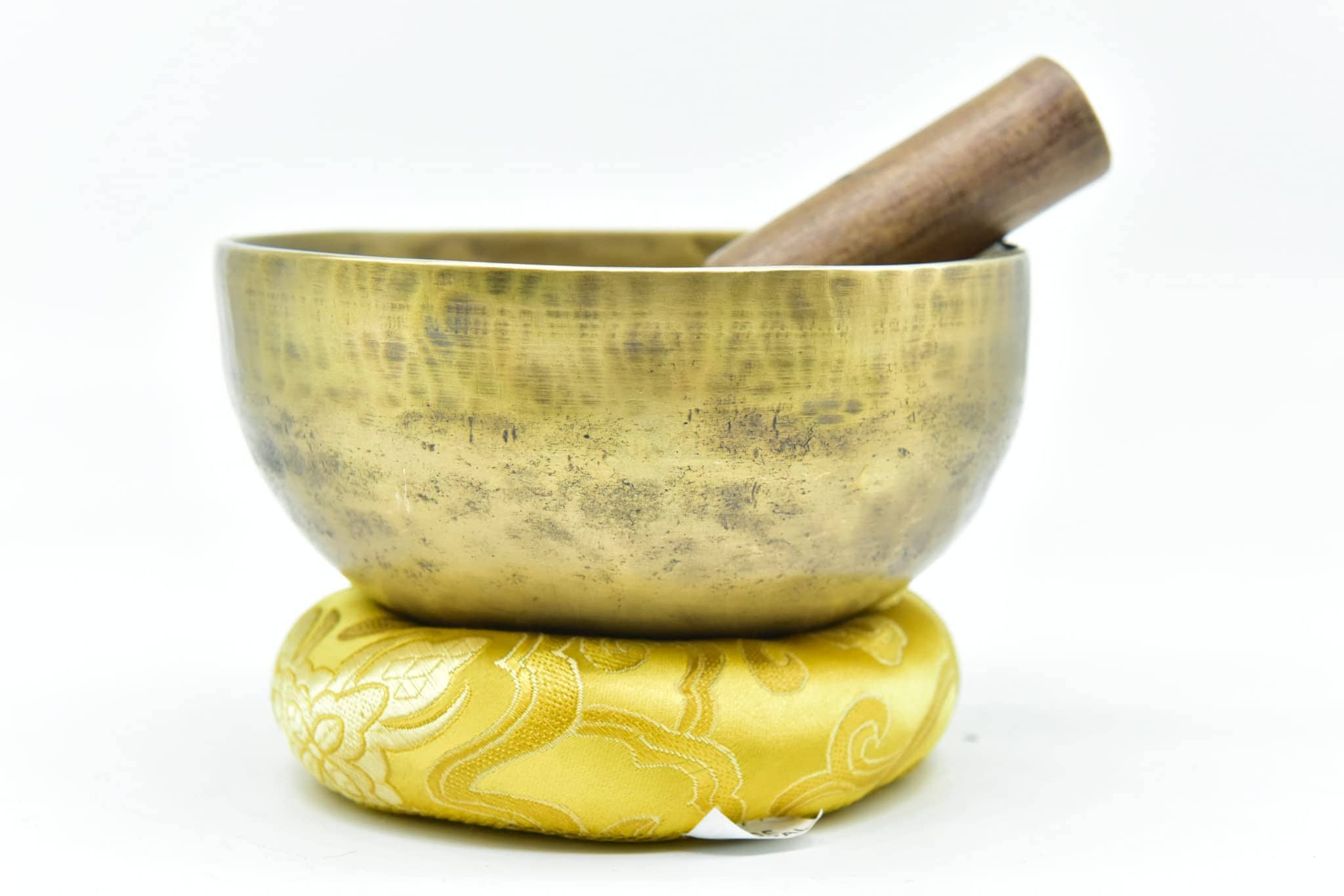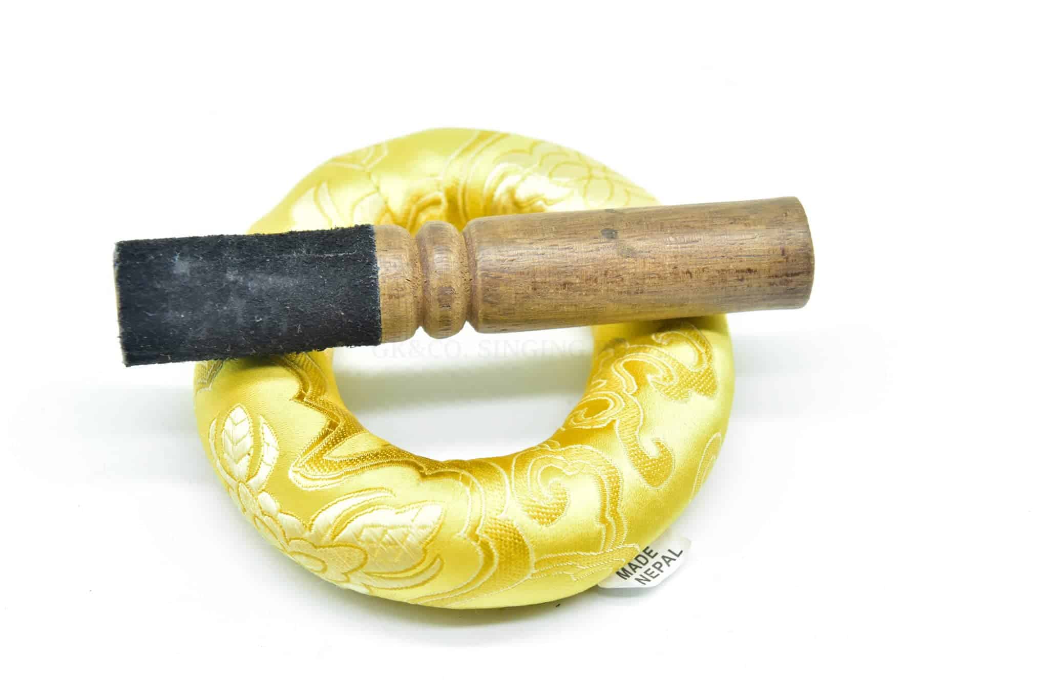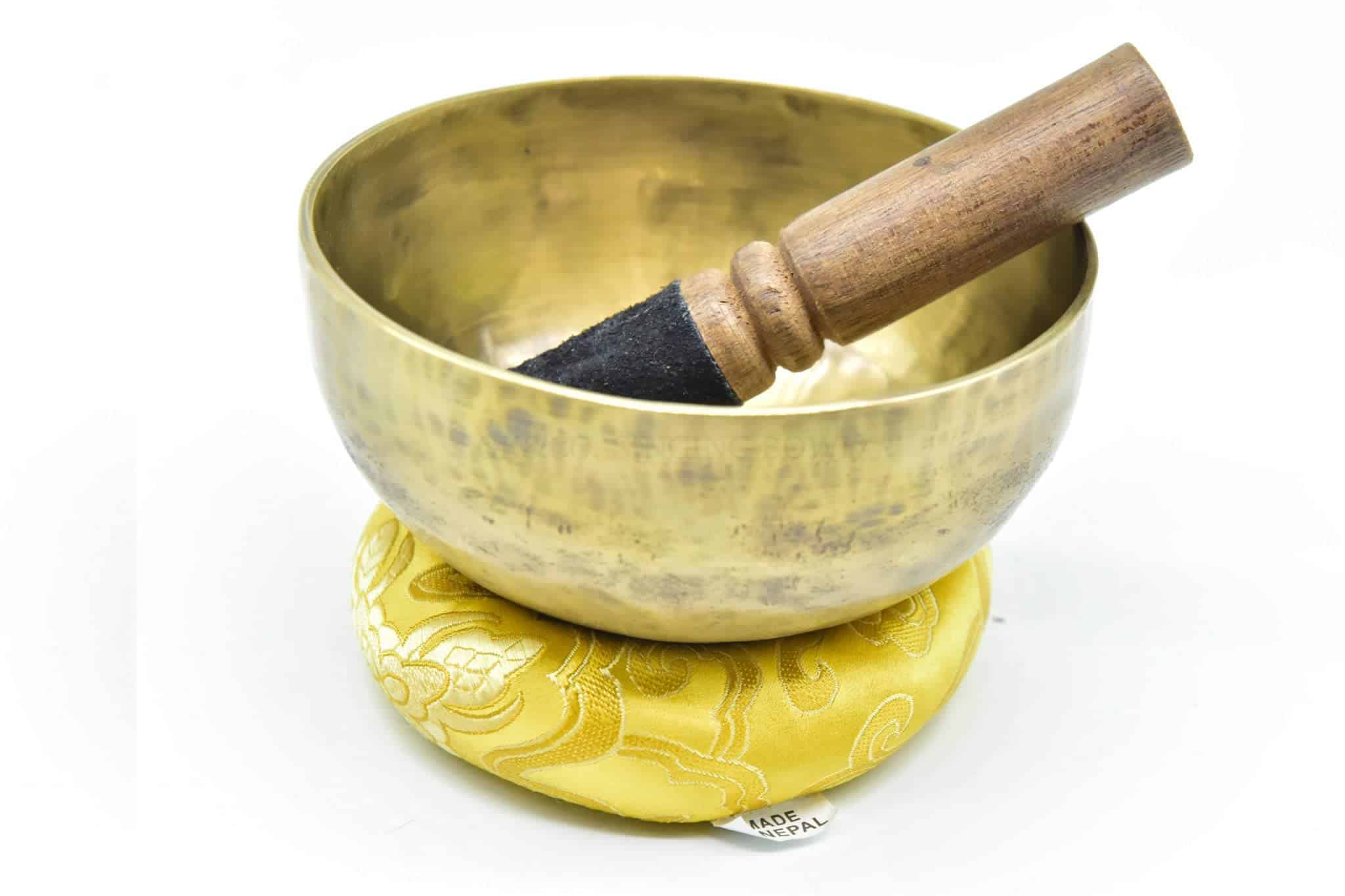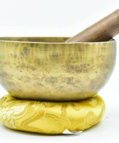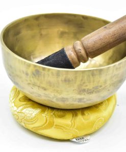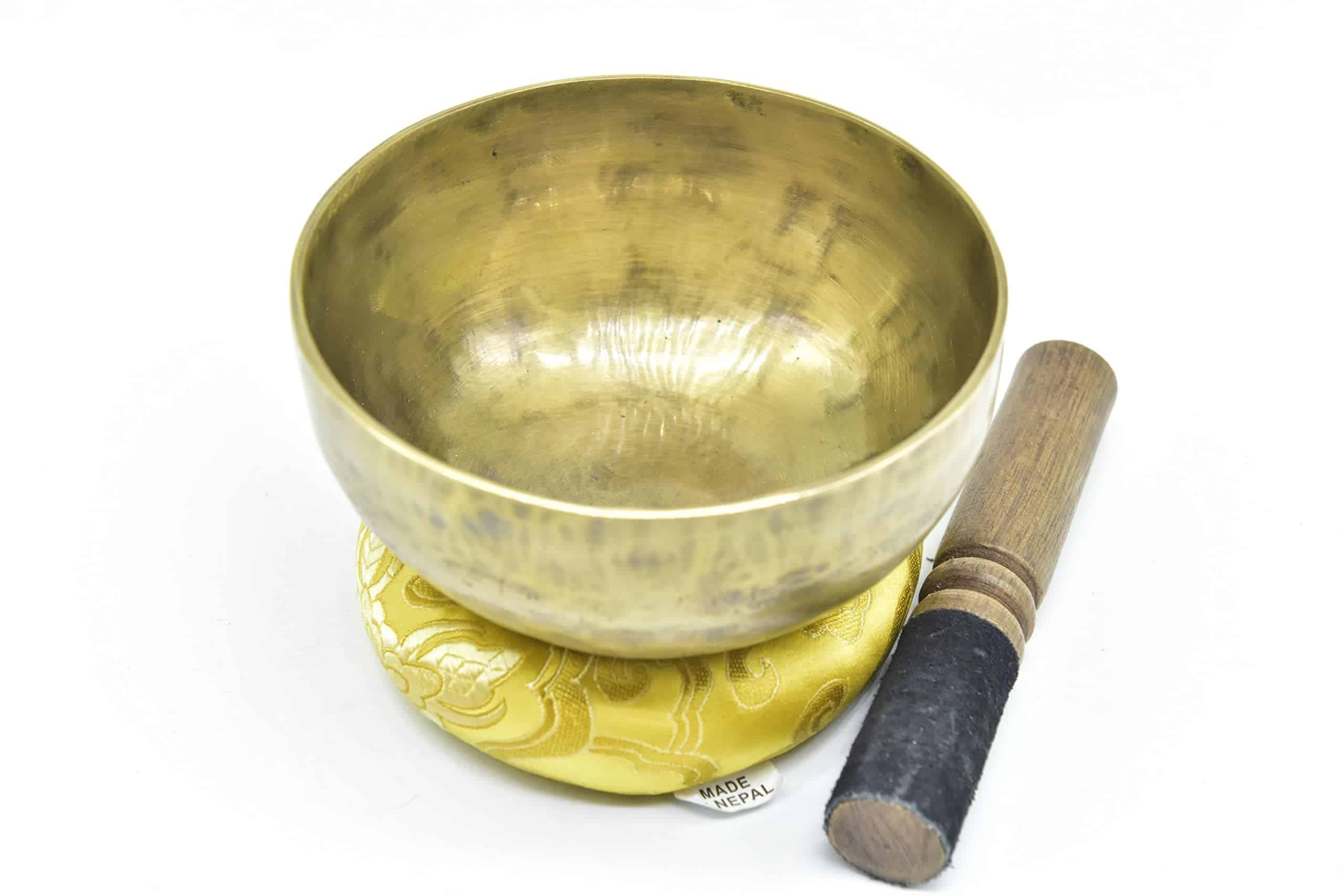 Este es un juego completo de Cuenco Tibetano de 5 pulgadas hecho a mano con aleación de bronce de siete metales (también conocida como metales de campana), que incluye un mazo de madera con envoltura de cuero de gamuza y cojín de seda cosido. Es un cuenco con acabado mate. Puede ver marcas de martilleo en el interior y exterior de los cuencos ya que están hechos a mano por artesanos locales en Nepal. Sonido exquisito y fácil de tocar: El sonido producido por este cuenco tibetano toca tu alma, un sonido armónico muy bien afinado con efectos relajantes y meditativos. Crea un hermoso sonido calmante y relajante cuando se toca alrededor del borde con el mazo. Los tonos únicos crean el estado perfecto para una profunda meditación y relajación. Puede alcanzar una profunda paz interior y sincronizarse creando sonido con vibración al golpear la superficie externa del cuenco con una baqueta.