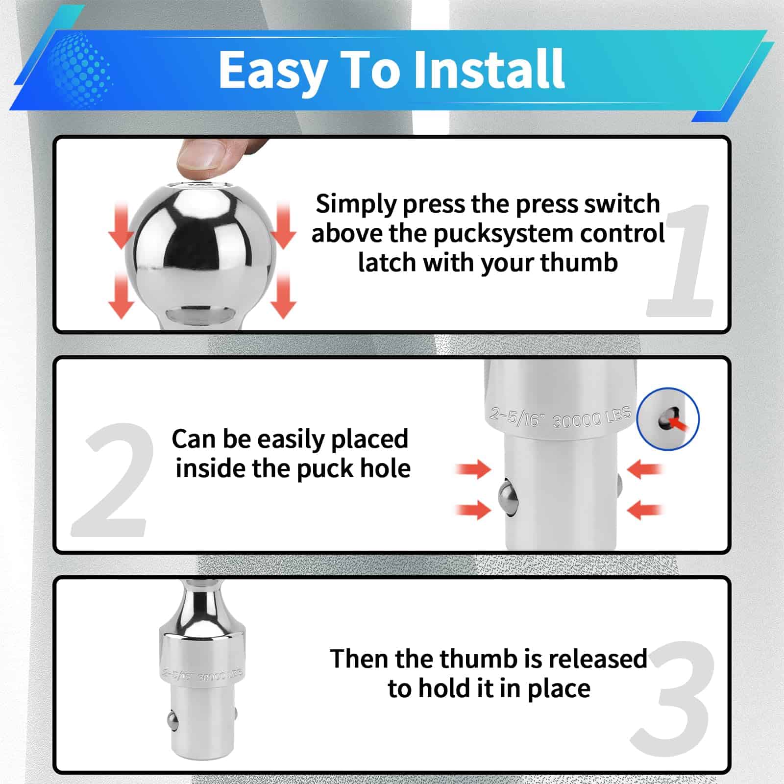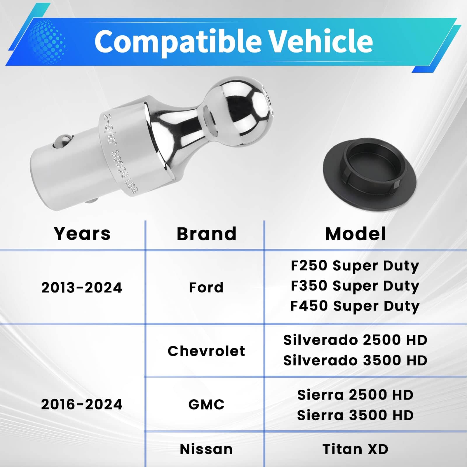 La Bola de Enganche para Barra de Remolque de Sistema de Disco Puck de 2-5/16 Pulgadas es la elección perfecta para todos sus remolques de quinta rueda y gooseneck. Fabricada según las especificaciones OEM, esta bola de enganche cumple o supera los estándares de calidad OEM, lo que garantiza su robustez y durabilidad. Con una capacidad de remolque de hasta 30,000 lbs. GTW y 7,500 lbs. de carga vertical, esta bola de enganche puede manejar sus necesidades de remolque normales con facilidad. Compatible con una variedad de modelos, incluidos Ford F-250 Super Duty/ F-350 Super Duty/ F-450 Super Duty, Chevrolet Silverado 2500 HD/ Silverado 3500 HD, GMC Sierra 2500 HD/ Sierra 3500 HD y Nissan Titan XD, esta bola de enganche es una solución versátil para sus necesidades de remolque. Además, su instalación es rápida y sencilla, lo que le ahorra tiempo y le permite estar listo para remolcar en poco tiempo. Respaldada por nuestra garantía de satisfacción del 100%, puede estar seguro de que está obteniendo un producto de calidad con la Bola de Enganche para Barra de Remolque de Sistema de Disco Puck de 2-5/16 Pulgadas.