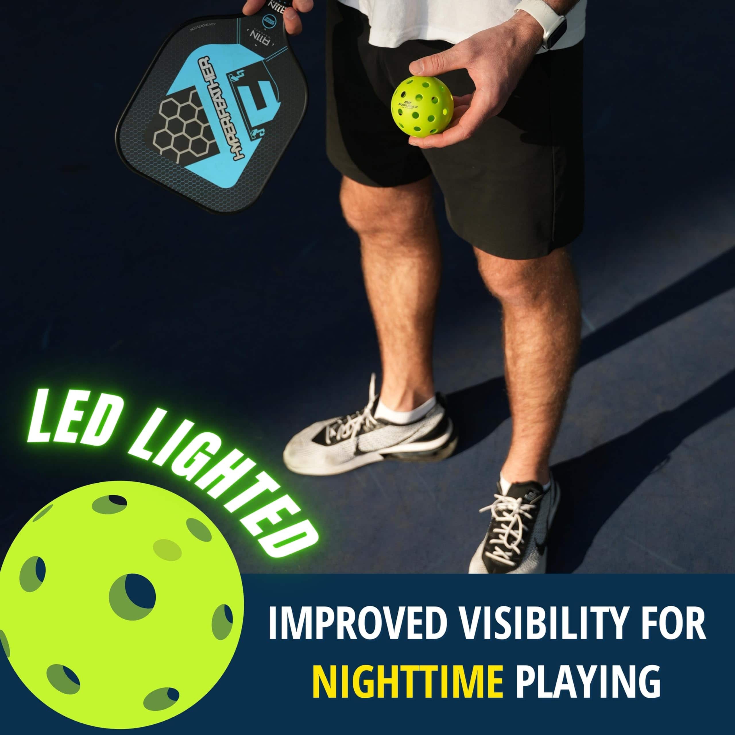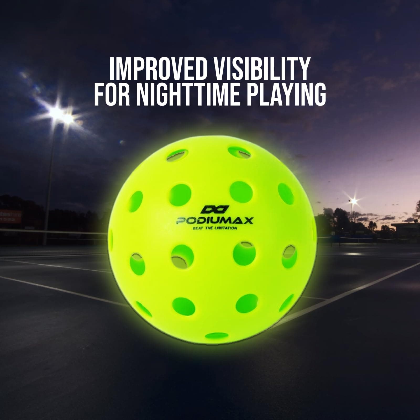 1. ¡MANTÉNGASE ACTIVO POR LA NOCHE – Las bolas de pickleball luminosas de PodiuMax proporcionan una visibilidad mejorada de la posición de la pelota y facilitan el seguimiento del movimiento en la oscuridad. ¡Disfruta de tu juego incluso después de que el sol se haya puesto!