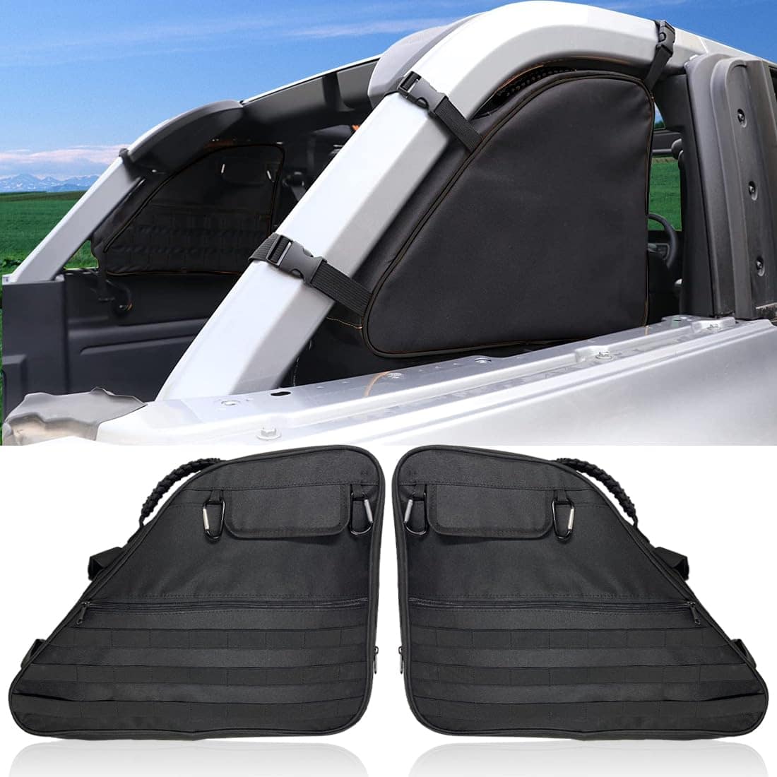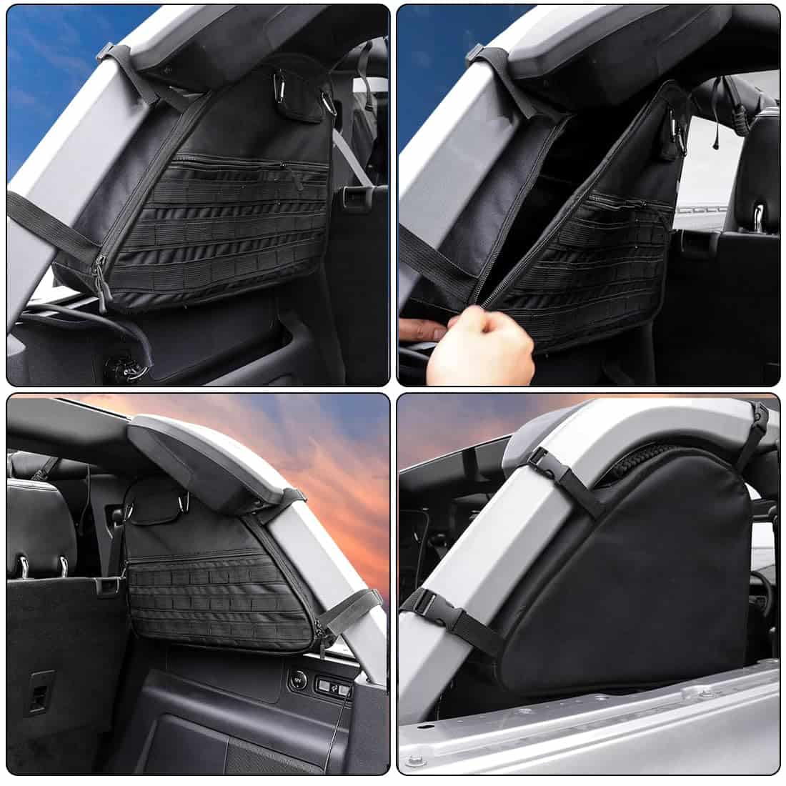 4. AJUSTE La bolsa de almacenamiento trasera de la barra de rodillo es apta para los maleteros traseros de 4 puertas del Ford Bronco 2021 2022 para jaulas de rodillo triangulares de 2 lados. (No apto para Bronco Sport y 2 puertas).