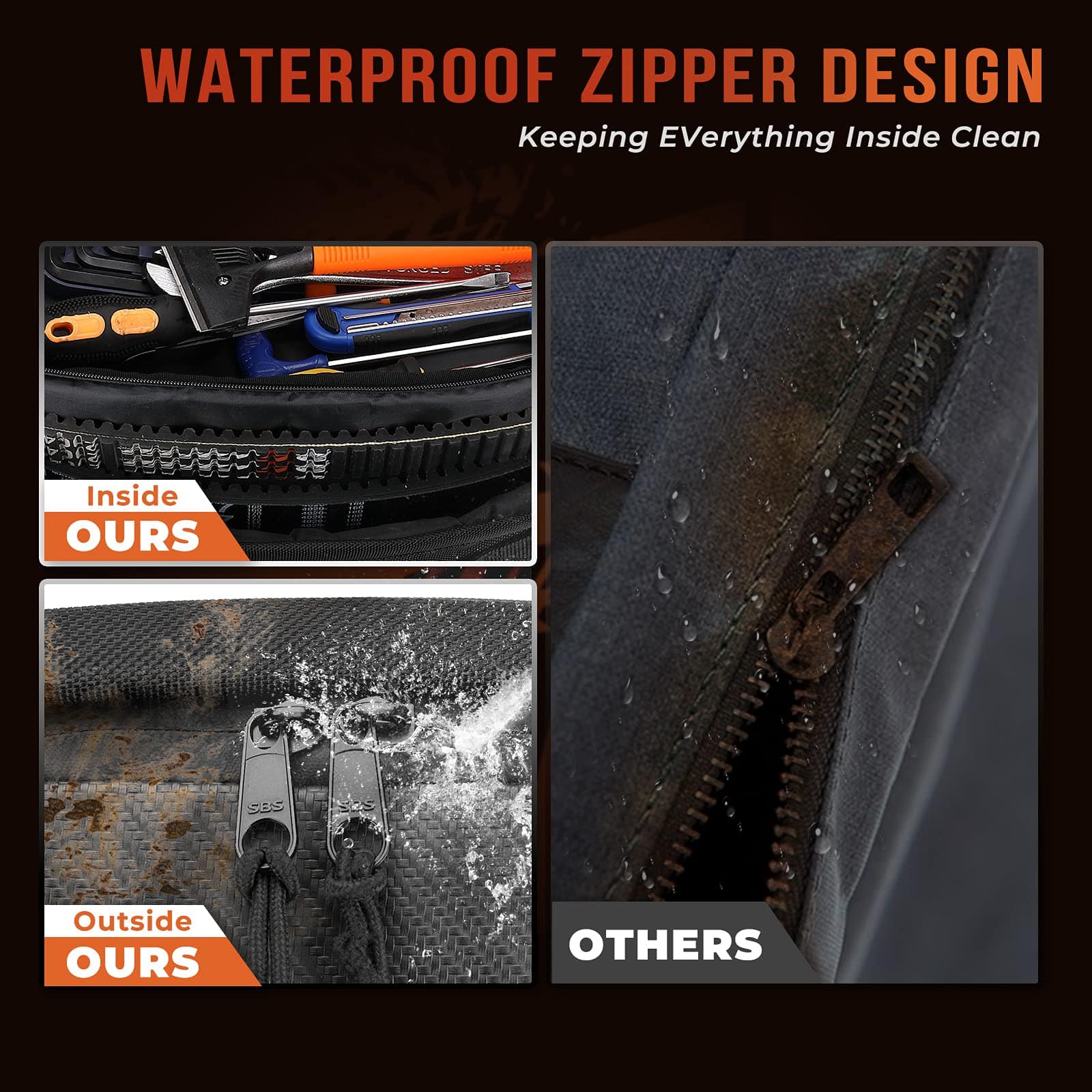 3. Mantén tus pertenencias seguras y secas en todo momento: La bolsa de correa de transmisión CVT UTV Kemimoto está equipada con una cremallera SBS resistente al agua y a la corrosión que brinda una apertura y cierre suaves y duraderos. Para mantener tus correas y herramientas secas y limpias en todo momento, la cremallera está protegida con una capa de tela para evitar que la suciedad, el barro y el polvo entren en la bolsa. De esta manera, tu bolsa de almacenamiento siempre estará limpia y seca, lista para utilizar en cualquier momento.