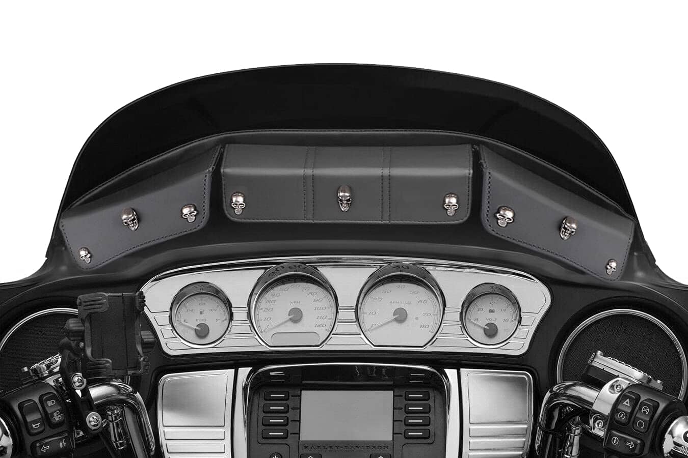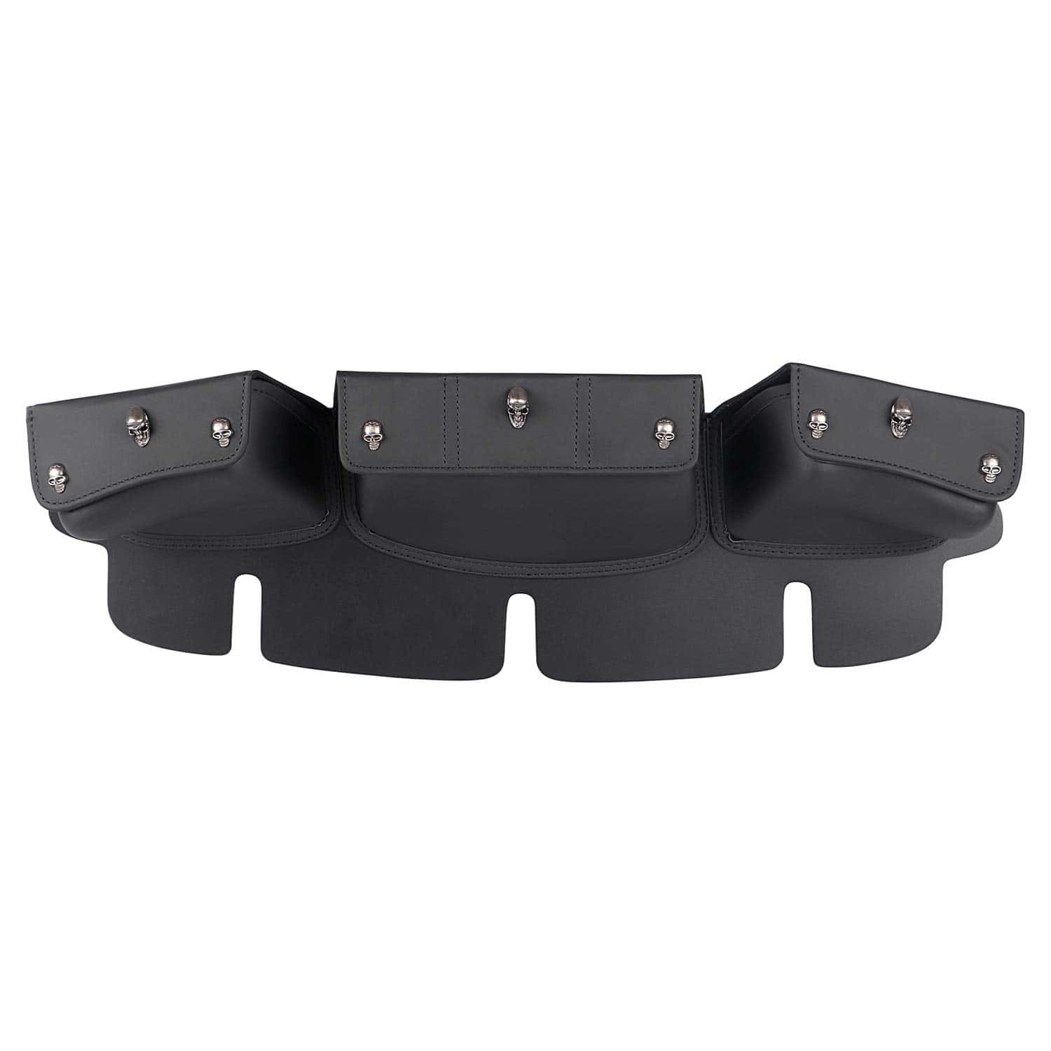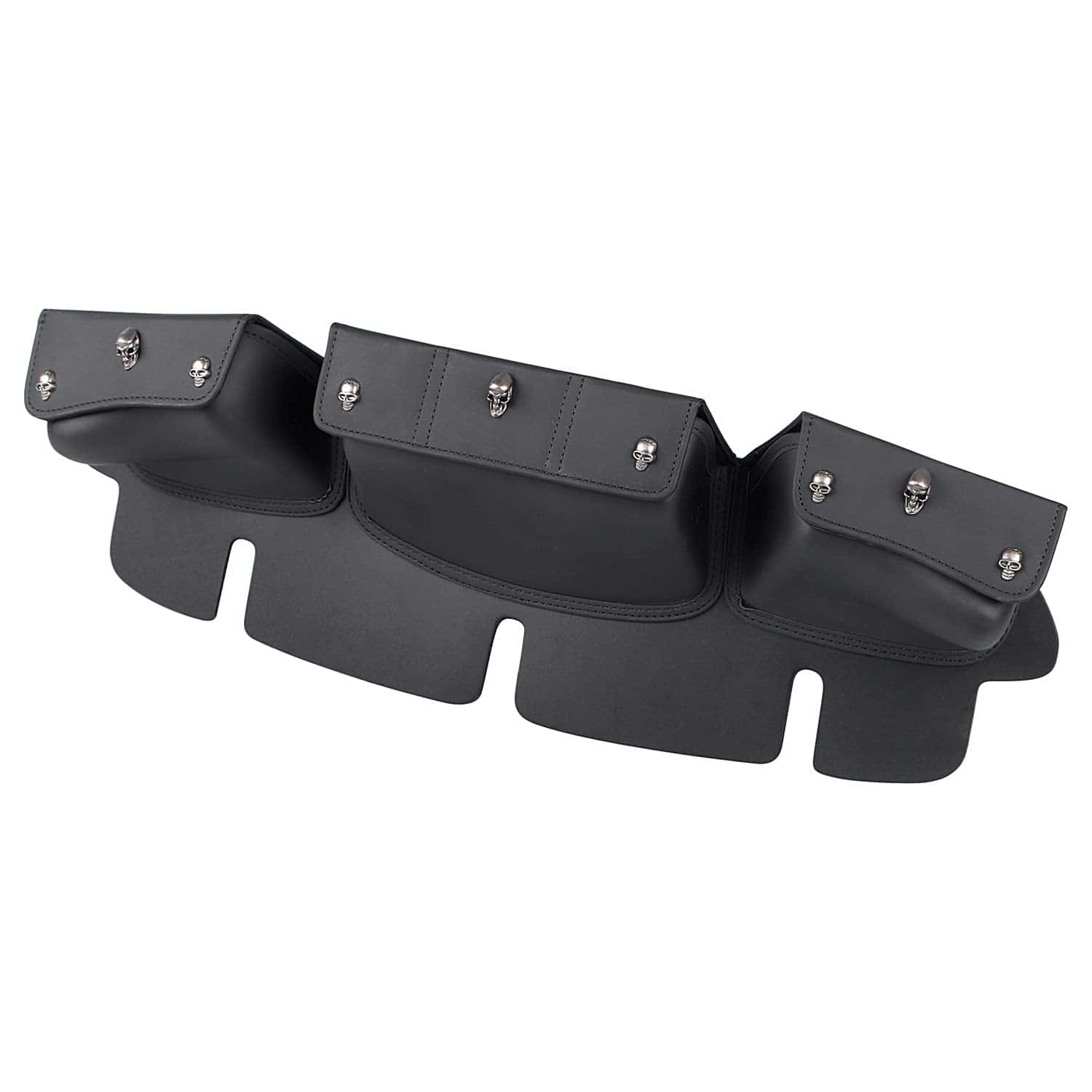 Mantenga los elementos esenciales pequeños al alcance de la mano con esta bolsa estructuralmente formada que abraza los contornos de la careta Batwing y el parabrisas. Fabricado en cuero PU, los cierres magnéticos resistentes aseguran un almacenamiento seguro y fácil acceso. Diseñado específicamente para un montaje fácil, máximo almacenamiento. Compatible con Harley Touring Electra Glide Street Glide 1996-2013 FLHX, FLHT, FLHTC, FLHTCU, etc, con parabrisas. Incluye 1 bolsa de parabrisas.