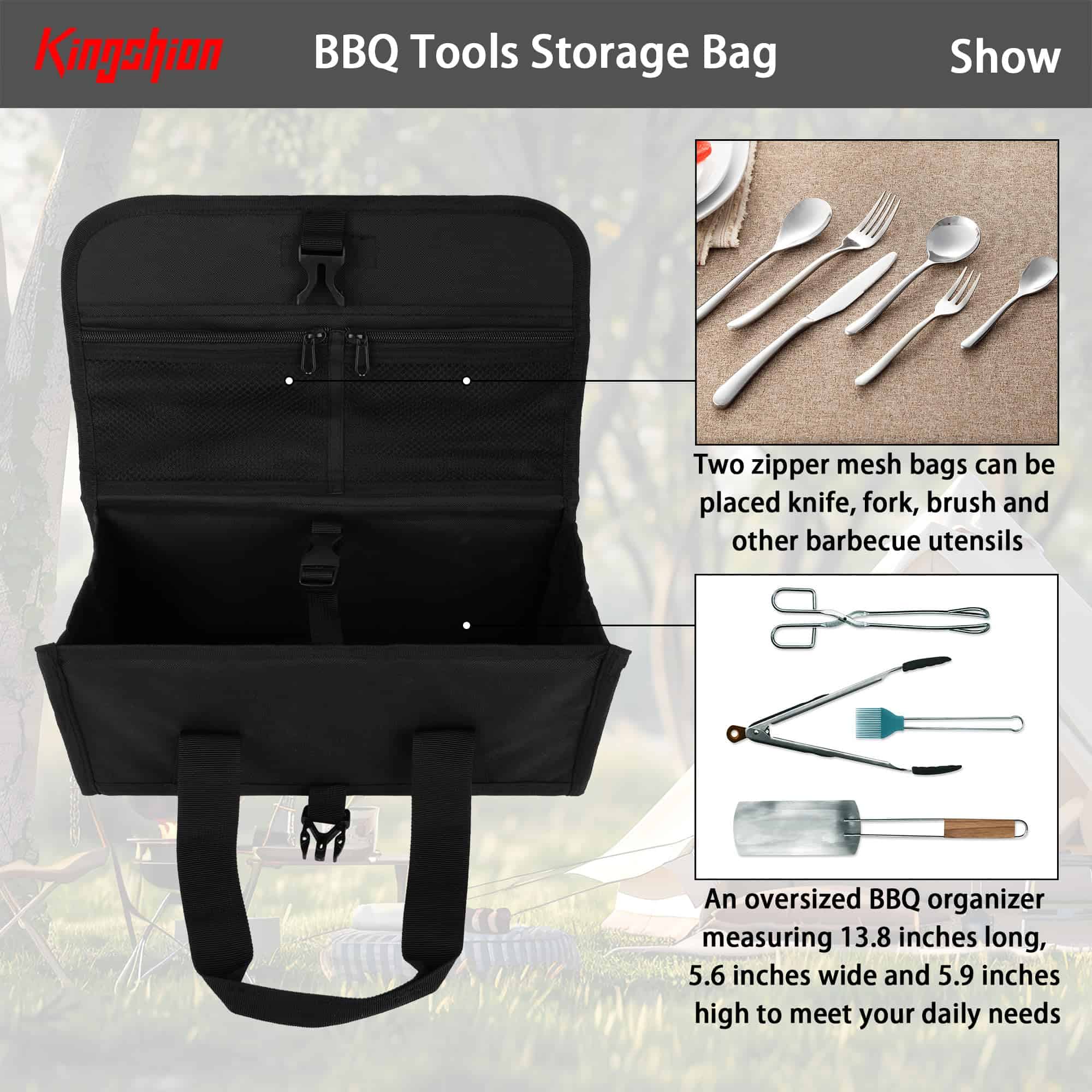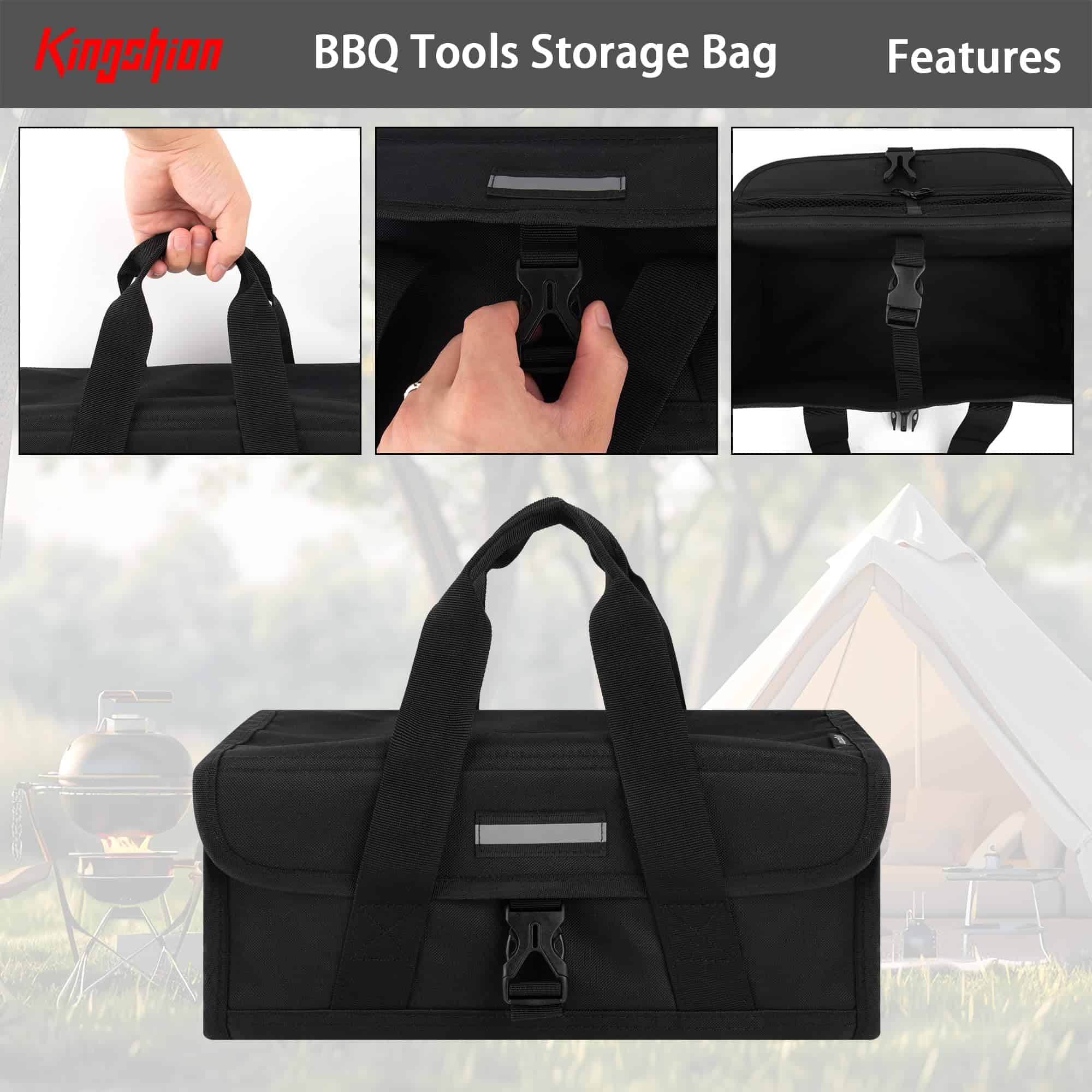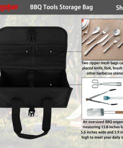 1. MATERIAL CONFIABLE: La bolsa de herramientas para parrilla está hecha de poliéster, lavable a máquina y reutilizable, resistente y seguro, no se desvanece fácilmente, conveniente de usar. 2. FÁCIL DE ALMACENAR: Diseño plegable, fácil de guardar cuando no se usa, ahorra espacio. 3. FÁCIL DE TRANSPORTAR: La bolsa de almacenamiento para utensilios de barbacoa viene con una correa de asa suave, fácil de transportar para herramientas de barbacoa. 4. DIMENSIONES DEL PRODUCTO: 13.8″ x 5.9″ x 5.9″ / 35 x 15 x 15 cm. 5. CONTENIDO DEL PAQUETE: Bolsa de Herramientas para Barbacoa x 1