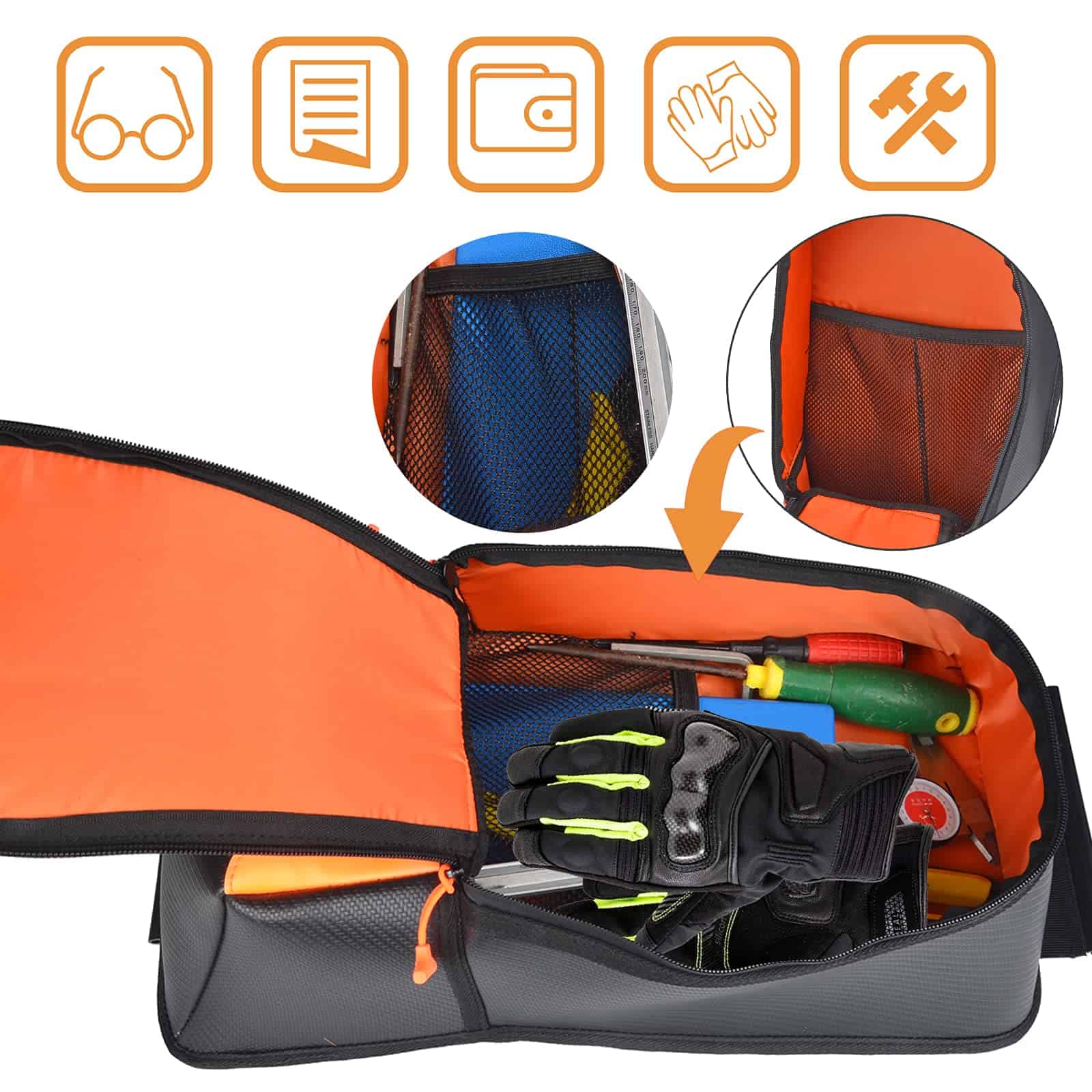 1. Bolsa de almacenamiento para asiento central de UTV FHV que se adapta a Can am Maverick X3 XRS XDS Turbo R Max 2017-2021. 2. La bolsa de engranaje para asiento central de UTV FHV está hecha de tela de nylon recubierto 1680D con un acabado duradero repelente al agua. Entonces la bolsa para maverick X3 no se mojará fácilmente mientras el agua salpica. 3. Un gran lugar para guardar gafas de sol, medidores de neumáticos, teléfonos celulares, prismáticos, etc. 4. Simplemente colóquelo en el centro de su maverick X3 y luego encaje para completar la instalación. 5. 1 pieza X Bolsa de almacenamiento para asiento central UTV de estilo naranja Bolsa organizadora de herramientas para Can am maverick X3 XRS XDS Turbo R Max 2017-2021