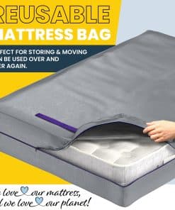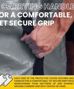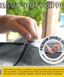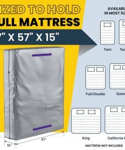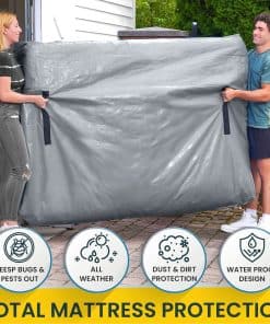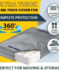 Bolsa de almacenamiento para colchón tamaño completo – Proteja su colchón durante mudanzas y almacenamiento prolongado con la bolsa de colchón tamaño completo de King-A-Ma-Jigs. Fabricada con un material poli tejido fuerte y resistente a desgarros, esta cubierta protectora de colchón proporciona protección completa en todas las estaciones, contra agua, polvo y daños UV. La bolsa de colchón para exteriores con cremallera está diseñada para cerrar completamente su colchón y facilitar su transporte a través de múltiples asas en los lados. Con un tamaño de 77″ x 57″ x 15″, esta bolsa de colchón de plástico grueso de 10 mil es perfecta para colchones tamaño completo y también se puede utilizar para proteger muebles más voluminosos como sofás, sillas y decoración estacional. Asegúrese de proteger su inversión en colchones con la bolsa de colchón tamaño completo de King-A-Ma-Jigs para mudanzas, almacenamiento a largo plazo y renovaciones en el hogar.