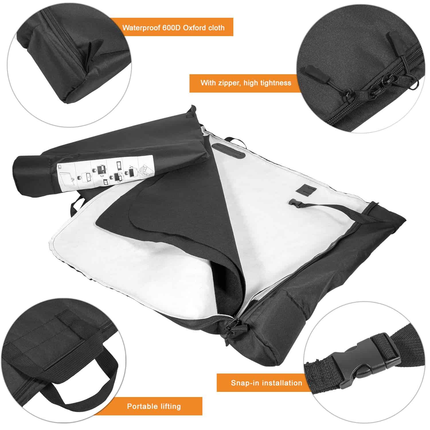 Gracias a su diseño innovador, la bolsa de almacenamiento se ata verticalmente en el lado trasero del asiento trasero, manteniéndola alejada de posibles daños y arañazos. Cuando desees quitar la ventana trasera para actividades al aire libre, simplemente coloca las ventanas suaves en la bolsa de almacenamiento y disfruta de un almacenamiento seguro y conveniente.