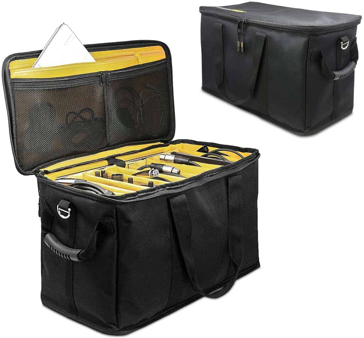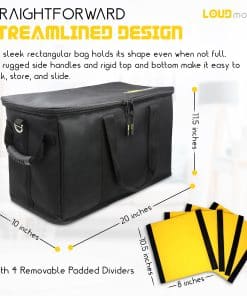 Esta bolsa de archivo para cables duradera tiene compartimentos acolchados y divisores desmontables que te permiten ajustar el espacio para llevar cualquier equipo que necesites. Fabricado con poliéster recubierto de PVC 900d resistente, con un fondo y una tapa acolchados para evitar hundimientos. Soporta hasta 55 libras, por lo que no tendrás que preocuparte por sobrecargar este estuche organizador de cables resistente. Compartimento muy acolchado para laptop de hasta 17″, con tres bolsillos con cremallera en la tapa para papeles, cables o accesorios. Diseño simple y sin bolsillos exteriores para un almacenamiento, apilado y deslizado más sencillo. Las 4 divisiones rígidas desmontables/ajustables te permiten crear un ajuste personalizado para objetos voluminosos o cajas, ofreciendo la mejor protección.