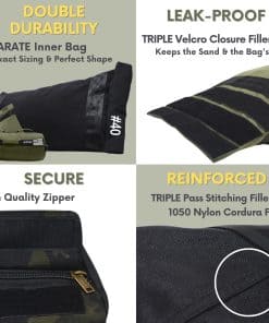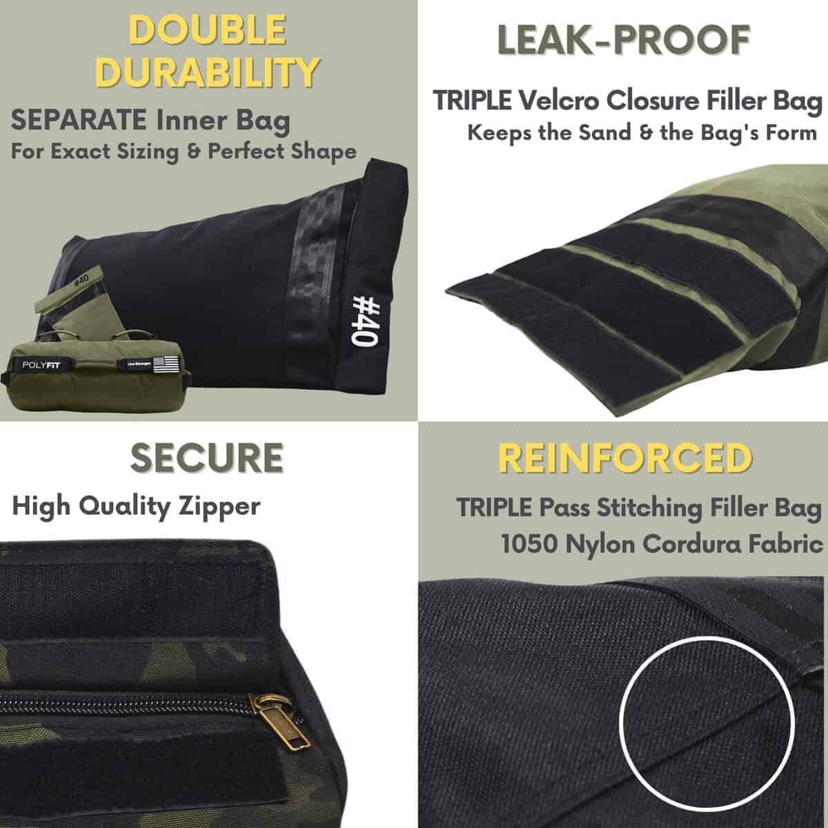4. EXTRA DURABILIDAD | COSTURAS REFORZADAS DE TRIPLE PASONuestra Bolsa de Arena Pro presenta costuras reforzadas de triple pasada para una durabilidad excepcional, asegurando que pueda soportar los entrenamientos más rigurosos y cargas pesadas sin la preocupación de que las costuras se separen.