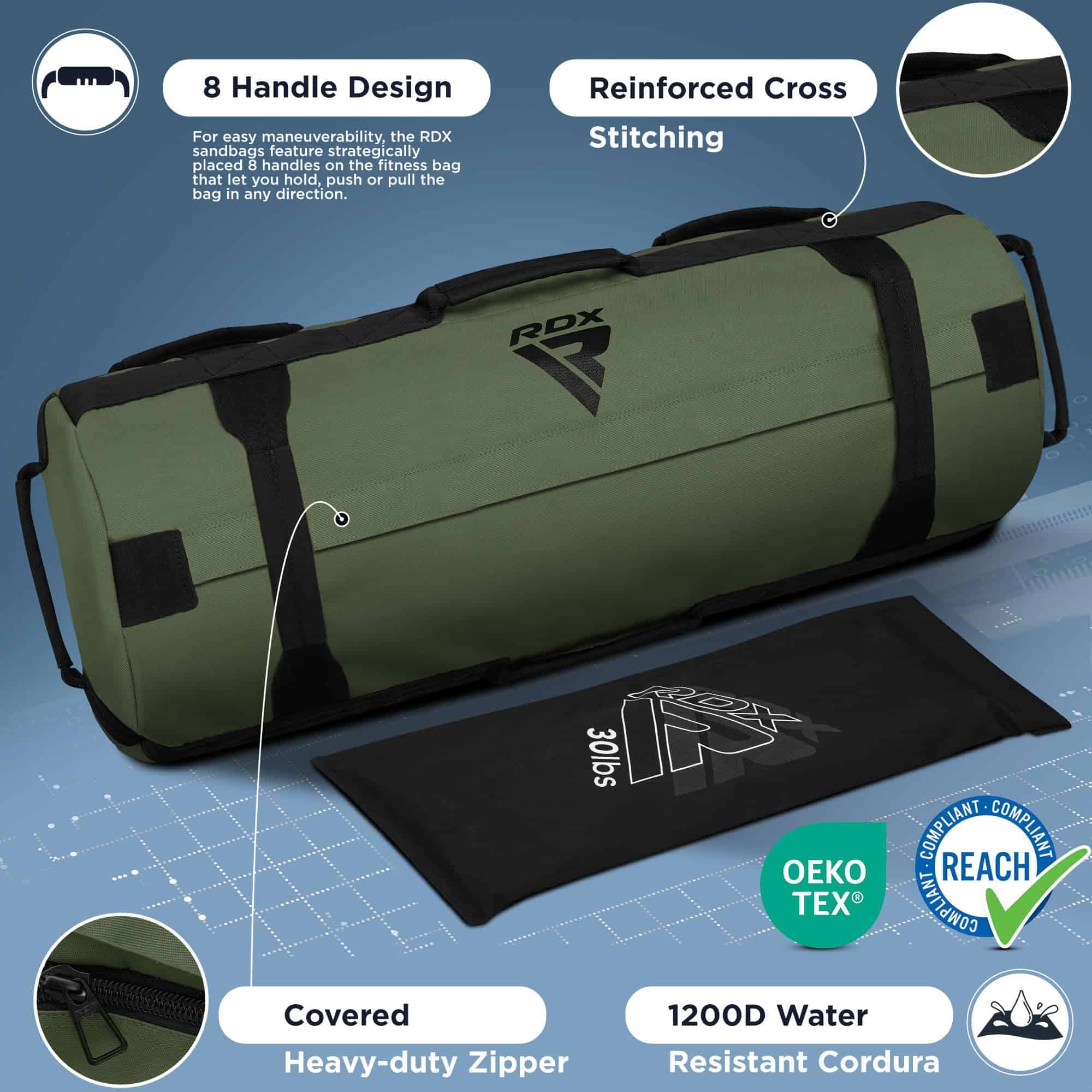 Esta bolsa de arena RDX es perfecta para el entrenamiento de pesas y acondicionamiento físico en casa o en el gimnasio. Viene sin llenar, lo que te permite personalizar el peso llenando las bolsas internas con arena para tu propia preferencia. La bolsa está diseñada con una resistencia excepcional y durabilidad incomparable, fabricada con tejido Cordura de 1200 Denier y revestimiento de nylon en el interior para una mayor durabilidad y resistencia al agua. Cuenta con 8 asas estratégicamente colocadas para una alta maniobrabilidad durante tus entrenamientos. Las bolsas internas están hechas con material resistente al agua para evitar cualquier filtración de arena. Además, viene en 4 tamaños diferentes con capacidad de peso variada para adaptarse a tus necesidades de entrenamiento. Potencia tu fuerza, velocidad y resistencia con esta bolsa de arena de entrenamiento versátil y duradera de RDX.