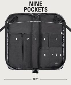 La Bolsa de Baquetas Clásica Tejida de Meinl tiene toda la dureza de una bolsa de gira con una apariencia elegante y atemporal. Nuestra tela exterior de poliéster tejido ultra resistente de 600D y peso pesado está respaldada con un revestimiento de PVC para una mayor dureza y estructura. Además, cuenta con detalles de cuero de gamuza en la parte inferior y en la cinta de la cremallera. Dentro del compartimento principal hay cinco bolsillos para organizar una gran cantidad de baquetas, cepillos, varillas y mazos (4 bolsillos grandes con fuelle y 1 bolsillo adicional en el borde). Además, hay cuatro bolsillos de accesorios de menor tamaño para piezas o efectos de sonido. Esta bolsa de baquetas viene equipada con ganchos y correas ajustables para tom base que permiten suspenderla en una posición abierta. Para un almacenamiento de acceso rápido, el bolsillo exterior grande tiene el tamaño adecuado para accesorios o herramientas comunes, y se cierra con cremallera para asegurar tus artículos. Una correa de hombro ajustable/desmontable y asas de tela gruesa reforzadas te permiten transportar esta bolsa cómodamente al concierto o estudio. Entrar en la bolsa es fácil con las cremalleras de gran tamaño que tiran en ambas direcciones. Las Bolsas de Baquetas Clásicas Tejidas de Meinl están diseñadas para la funcionalidad y el estilo para cualquier tipo de baterista que viaje.
