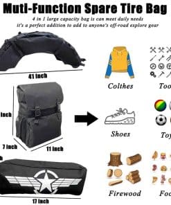 1. Bolsa de 4 en 1 de gran capacidad que puede satisfacer las necesidades diarias. Puede colocar equipo de recuperación, botiquín de primeros auxilios, paraguas, kits de herramientas de instalación, basura, leña, etc. 2. Tela pesada de alta resistencia y tela Oxford, impermeable, resistente y resistente al desgaste, evita el desgarro, la decoloración. 3. El diseño de bolsillo de malla hace que sea más conveniente para usted almacenar algunos objetos pequeños. Las cremalleras fáciles de usar le ayudan a abrir la bolsa de almacenamiento de herramientas de neumático de repuesto de la rueda trasera de manera rápida y suave. 4. Compatible con Wrangler, Jee-p, camión, RV o SUV, para neumáticos de repuesto de 245/75R17. 5. La bolsa de almacenamiento de repuesto trasero todoterreno es la elección perfecta para la gran experiencia de su viaje en carretera.