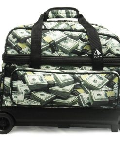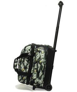 Bolsa de bolos Pyramid Path Deluxe Double Roller con bolsillo de accesorios grande en color dinero. Esta bolsa está construida con poliéster oxford 600 denier duradero que garantiza una larga vida útil. Cuenta con ruedas anchas de goma de 3″ para facilitar las maniobras y una base de ruedas ancha para mayor estabilidad. El mango cuadrado extensible de 21.5″ hace que sea fácil de llevar. La bolsa tiene capacidad para un par de zapatos de hasta talla 16 de hombre. Sus dimensiones son 21″ de largo, 15″ de alto y 13″ de ancho, lo que la hace lo suficientemente espaciosa para transportar tu equipo de bolos con comodidad.